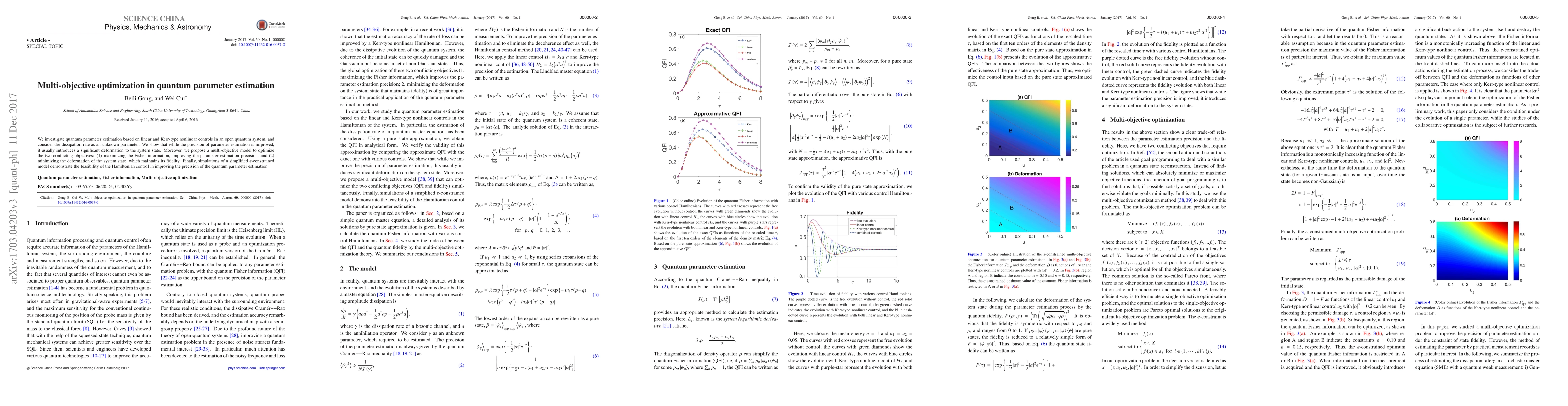 We investigate quantum parameter estimation based on linear and Kerr-type nonlinear controls in an open quantum system, and consider the dissipation rate as an unknown parameter. We show that while the precision of parameter estimation is improved, it usually introduces a significant deformation to the system state. Moreover, we propose a multi-objective model to optimize the two conflicting objectives: (1) maximizing the Fisher information, improving the parameter estimation precision, and (2) minimizing the deformation of the system state, which maintains its fidelity. Finally, simulations of a simplified {\epsilon}-constrained model demonstrate the feasibility of the Hamiltonian control in improving the precision of the quantum parameter estimation.