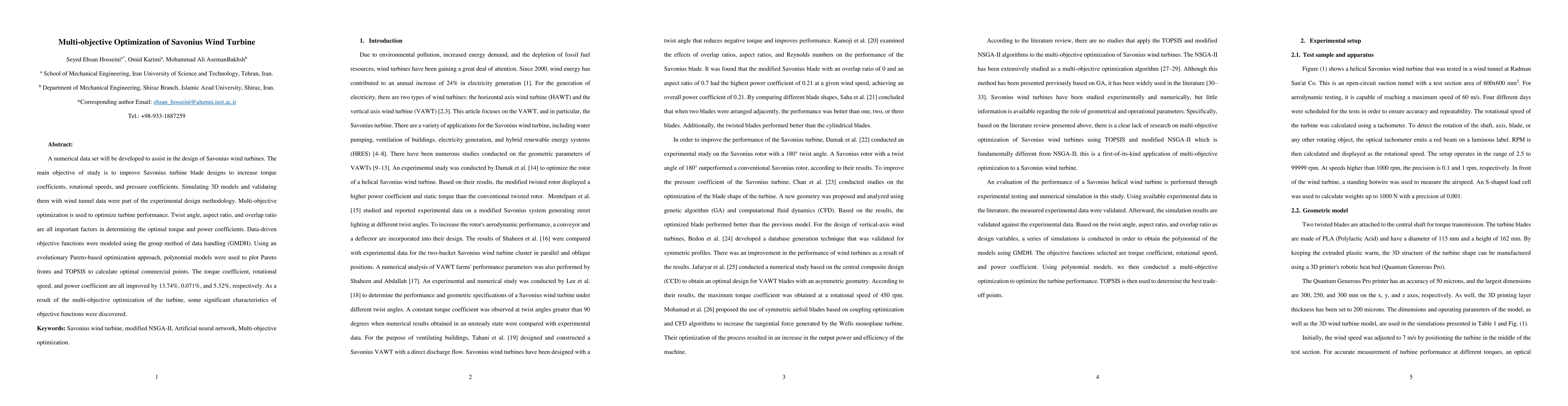 This study optimizes the design of Savonius wind turbines using multi-objective optimization techniques to enhance torque, rotational speed, and power coefficients. The research employs 3D simulations, wind tunnel validation, and evolutionary Pareto-based optimization to determine optimal twist angle, aspect ratio, and overlap ratio.