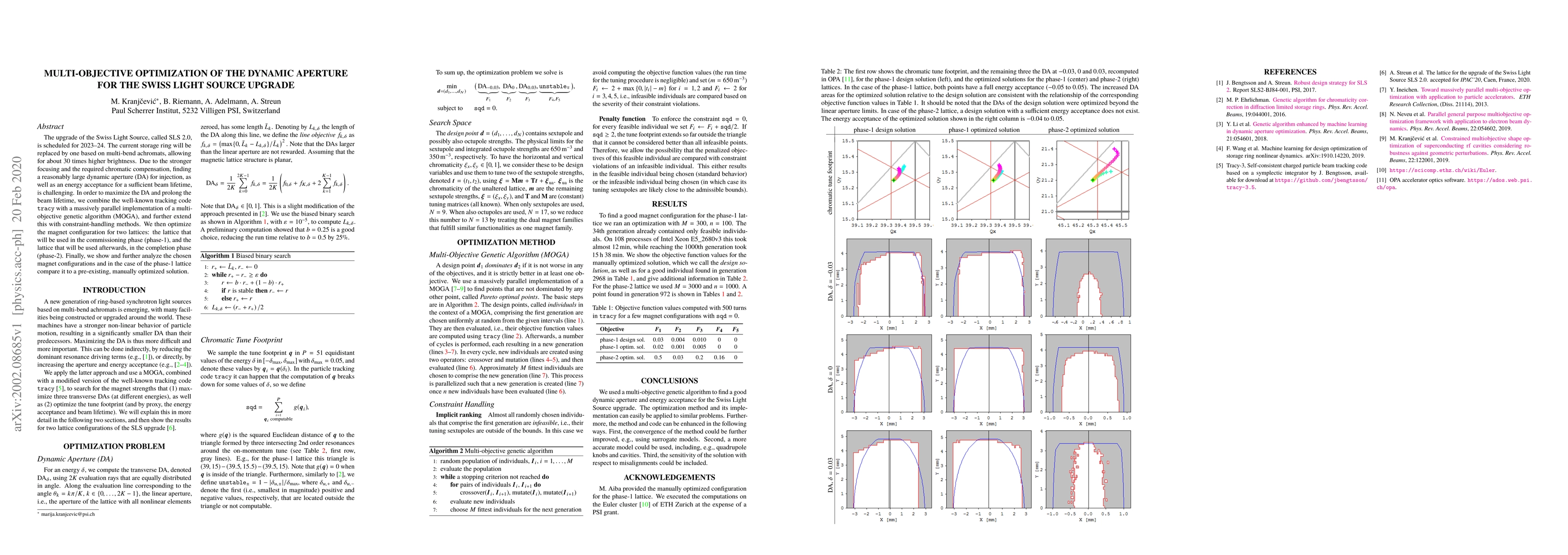 This paper presents a multi-objective optimization approach to determine the dynamic aperture for the upgraded Swiss Light Source (SLS 2.0), combining a tracking code with a parallel genetic algorithm to optimize magnet configurations for two different lattice phases, aiming to maximize brightness and beam lifetime. The results are compared with a previously optimized solution for the initial phase.