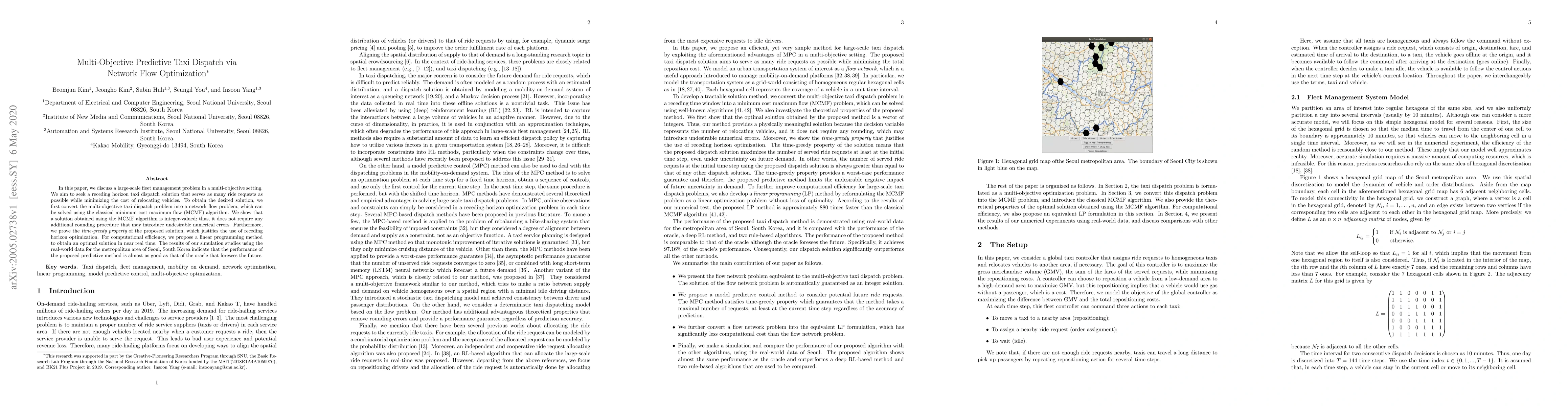 In this paper, we discuss a large-scale fleet management problem in a multi-objective setting. We aim to seek a receding horizon taxi dispatch solution that serves as many ride requests as possible while minimizing the cost of relocating vehicles. To obtain the desired solution, we first convert the multi-objective taxi dispatch problem into a network flow problem, which can be solved using the classical minimum cost maximum flow (MCMF) algorithm. We show that a solution obtained using the MCMF algorithm is integer-valued; thus, it does not require any additional rounding procedure that may introduce undesirable numerical errors. Furthermore, we prove the time-greedy property of the proposed solution, which justifies the use of receding horizon optimization. For computational efficiency, we propose a linear programming method to obtain an optimal solution in near real time. The results of our simulation studies using real-world data for the metropolitan area of Seoul, South Korea indicate that the performance of the proposed predictive method is almost as good as that of the oracle that foresees the future.