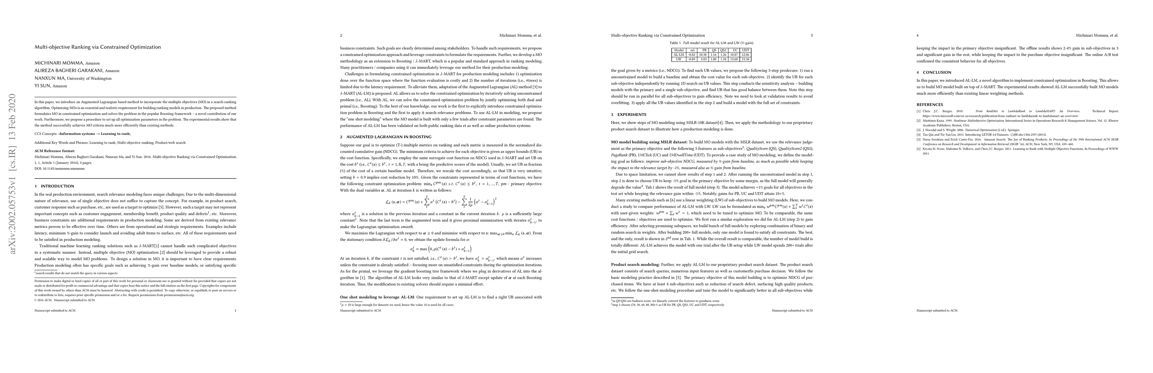Researchers introduce a new method for optimizing multiple objectives in ranking algorithms using constrained optimization with Boosting framework, achieving more efficient results than existing methods.