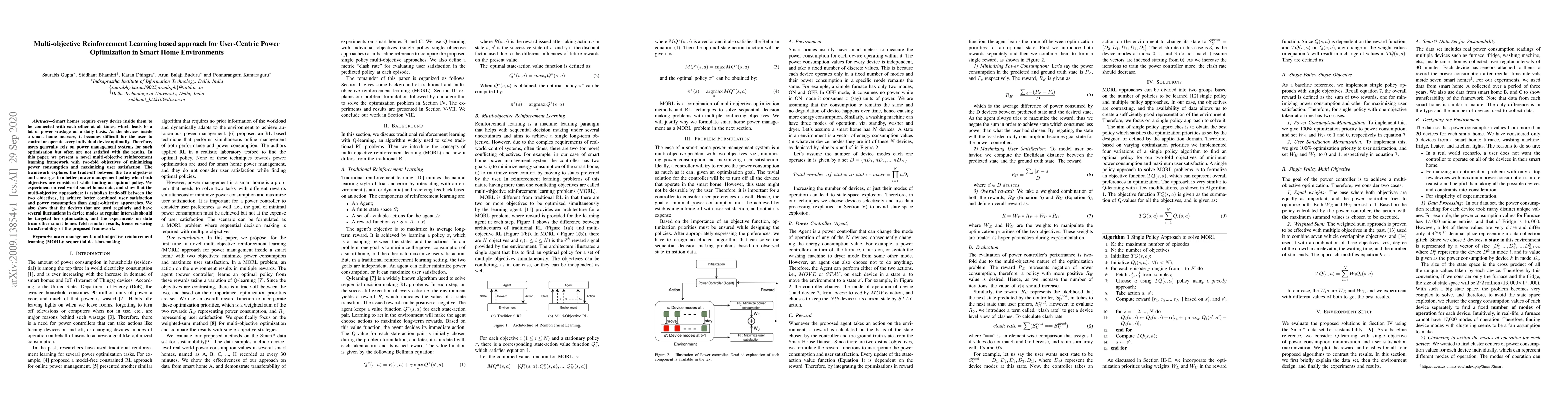 This paper proposes a multi-objective reinforcement learning framework to optimize power consumption and maximize user satisfaction in smart homes. Experiments demonstrate that the approach achieves better results than single-objective methods and highlights the importance of optimizing frequently used devices with mode fluctuations.