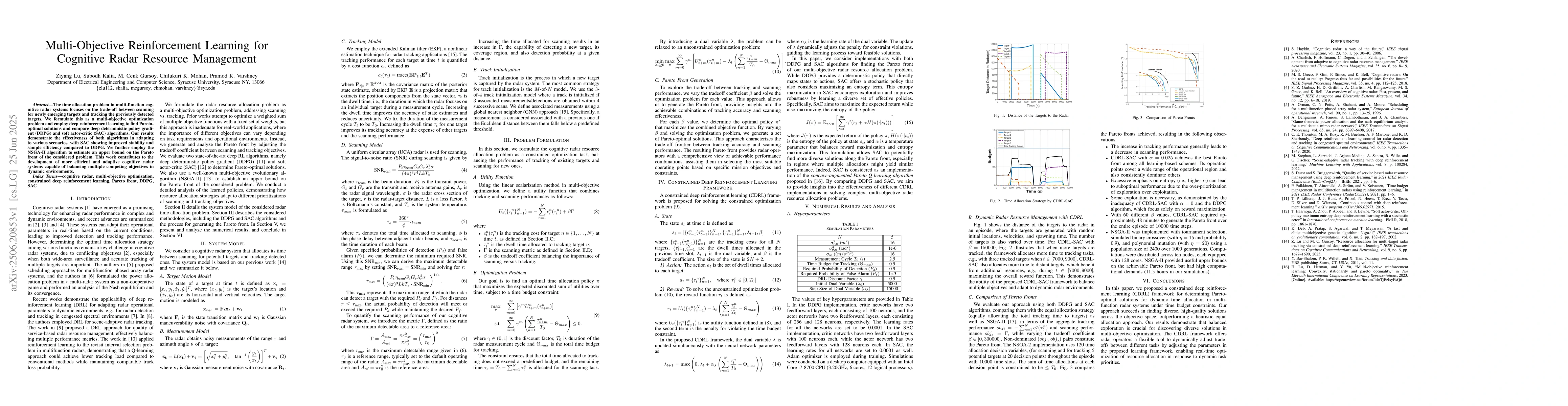 The time allocation problem in multi-function cognitive radar systems focuses on the trade-off between scanning for newly emerging targets and tracking the previously detected targets. We formulate this as a multi-objective optimization problem and employ deep reinforcement learning to find Pareto-optimal solutions and compare deep deterministic policy gradient (DDPG) and soft actor-critic (SAC) algorithms. Our results demonstrate the effectiveness of both algorithms in adapting to various scenarios, with SAC showing improved stability and sample efficiency compared to DDPG. We further employ the NSGA-II algorithm to estimate an upper bound on the Pareto front of the considered problem. This work contributes to the development of more efficient and adaptive cognitive radar systems capable of balancing multiple competing objectives in dynamic environments.