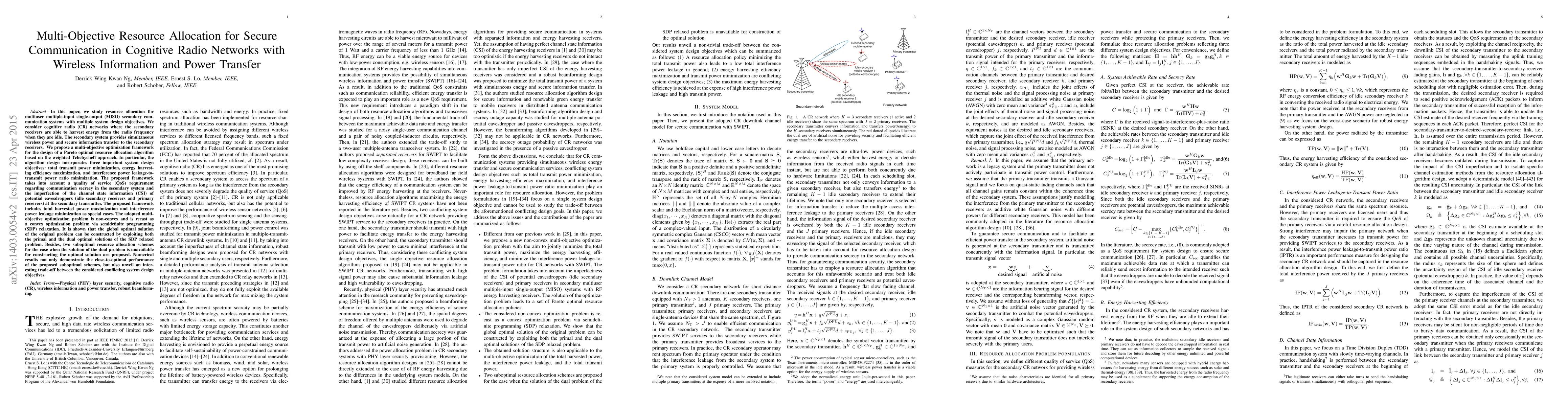 In this paper, we study resource allocation for multiuser multiple-input single-output secondary communication systems with multiple system design objectives. We consider cognitive radio networks where the secondary receivers are able to harvest energy from the radio frequency when they are idle. The secondary system provides simultaneous wireless power and secure information transfer to the secondary receivers. We propose a multi-objective optimization framework for the design of a Pareto optimal resource allocation algorithm based on the weighted Tchebycheff approach. In particular, the algorithm design incorporates three important system objectives: total transmit power minimization, energy harvesting efficiency maximization, and interference power leakage-to-transmit power ratio minimization. The proposed framework takes into account a quality of service requirement regarding communication secrecy in the secondary system and the imperfection of the channel state information of potential eavesdroppers (idle secondary receivers and primary receivers) at the secondary transmitter. The adopted multi-objective optimization problem is non-convex and is recast as a convex optimization problem via semidefinite programming (SDP) relaxation. It is shown that the global optimal solution of the original problem can be constructed by exploiting both the primal and the dual optimal solutions of the SDP relaxed problem. Besides, two suboptimal resource allocation schemes for the case when the solution of the dual problem is unavailable for constructing the optimal solution are proposed. Numerical results not only demonstrate the close-to-optimal performance of the proposed suboptimal schemes, but also unveil an interesting trade-off between the considered conflicting system design objectives.