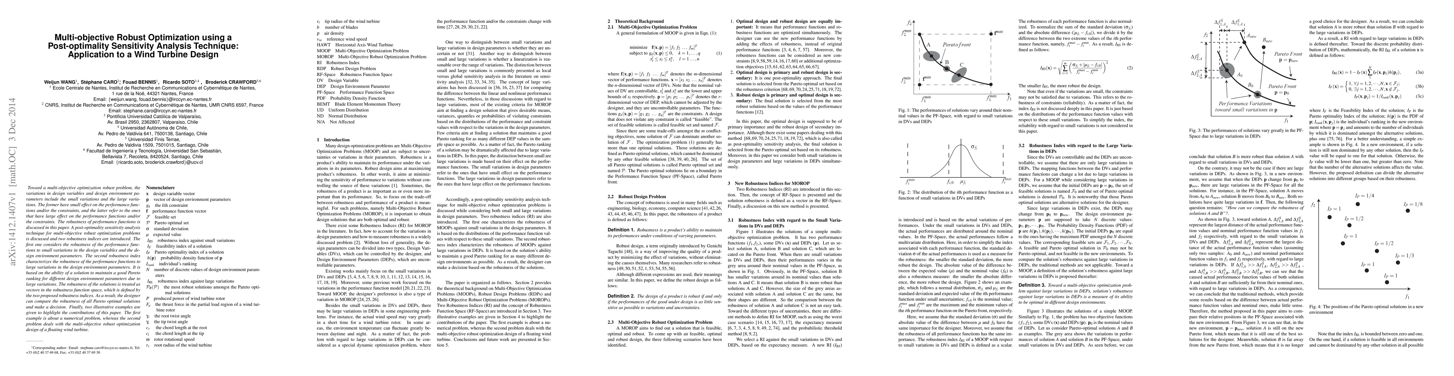 Toward a multi-objective optimization robust problem, the variations in design variables and design environment pa-rameters include the small variations and the large varia-tions. The former have small effect on the performance func-tions and/or the constraints, and the latter refer to the ones that have large effect on the performance functions and/or the constraints. The robustness of performance functions is discussed in this paper. A post-optimality sensitivity analysis technique for multi-objective robust optimization problems is discussed and two robustness indices are introduced. The first one considers the robustness of the performance func-tions to small variations in the design variables and the de-sign environment parameters. The second robustness index characterizes the robustness of the performance functions to large variations in the design environment parameters. It is based on the ability of a solution to maintain a good Pareto ranking for different design environment parameters due to large variations. The robustness of the solutions is treated as vectors in the robustness function space, which is defined by the two proposed robustness indices. As a result, the designer can compare the robustness of all Pareto optimal solutions and make a decision. Finally, two illustrative examples are given to highlight the contributions of this paper. The first example is about a numerical problem, whereas the second problem deals with the multi-objective robust optimization design of a floating wind turbine.