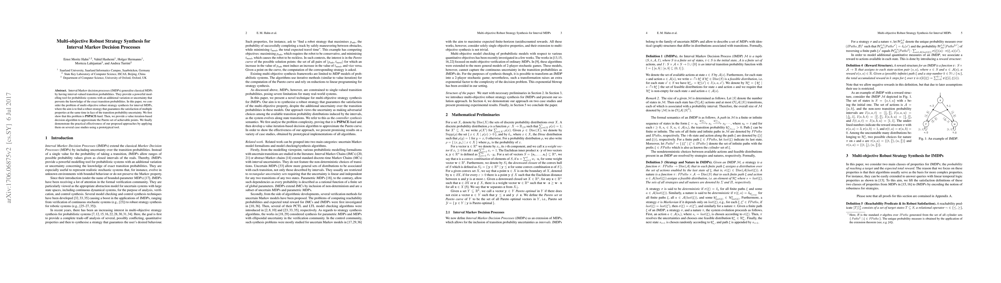 This paper addresses the multi-objective robust strategy synthesis for interval Markov decision processes (IMDPs), showing the problem's PSPACE-hardness and proposing a value iteration-based algorithm to approximate the Pareto set of achievable strategies. The effectiveness of the proposed method is demonstrated through practical applications in various case studies.
