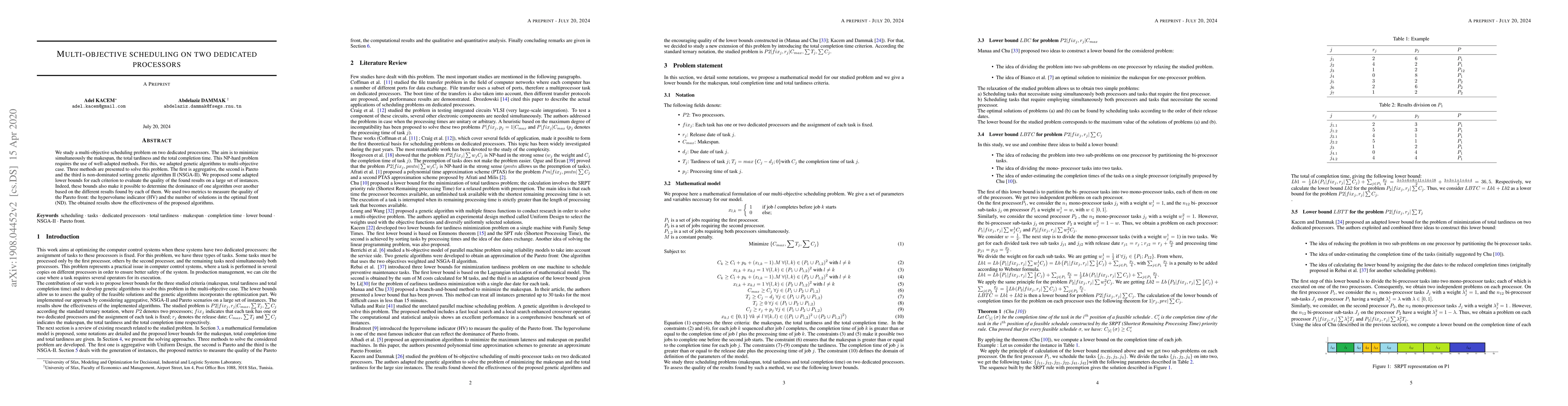 Researchers develop algorithms to optimize scheduling on two dedicated processors for multiple performance metrics, finding effective solutions using genetic algorithms.