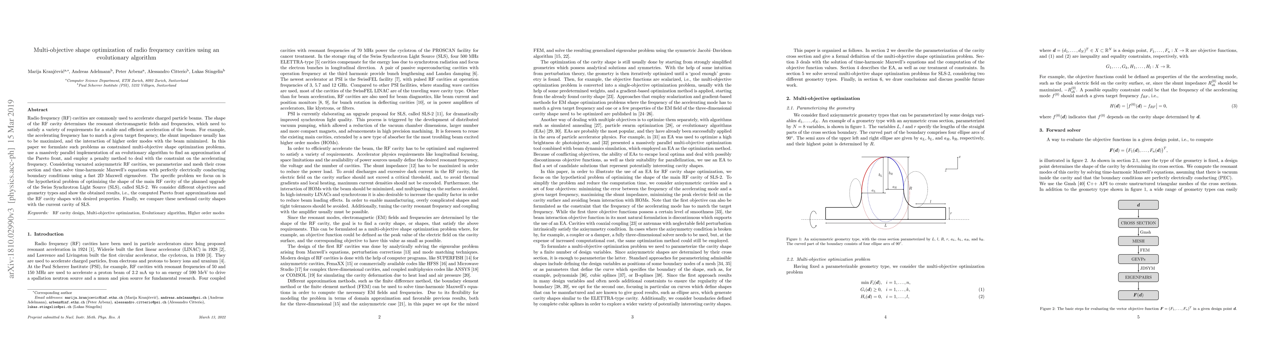 Radio frequency (RF) cavities are commonly used to accelerate charged particle beams. The shape of the RF cavity determines the resonant electromagnetic fields and frequencies, which need to satisfy a variety of requirements for a stable and efficient acceleration of the beam. For example, the accelerating frequency has to match a given target frequency, the shunt impedance usually has to be maximized, and the interaction of higher order modes with the beam minimized. In this paper we formulate such problems as constrained multi-objective shape optimization problems, use a massively parallel implementation of an evolutionary algorithm to find an approximation of the Pareto front, and employ a penalty method to deal with the constraint on the accelerating frequency. Considering vacuated axisymmetric RF cavities, we parameterize and mesh their cross section and then solve time-harmonic Maxwell's equations with perfectly electrically conducting boundary conditions using a fast 2D Maxwell eigensolver. The specific problem we focus on is the hypothetical problem of optimizing the shape of the main RF cavity of the planned upgrade of the Swiss Synchrotron Light Source (SLS), called SLS-2. We consider different objectives and geometry types and show the obtained results, i.e. the computed Pareto front approximations and the RF cavity shapes with desired properties. Finally, we compare these newfound cavity shapes with the current cavity of SLS.