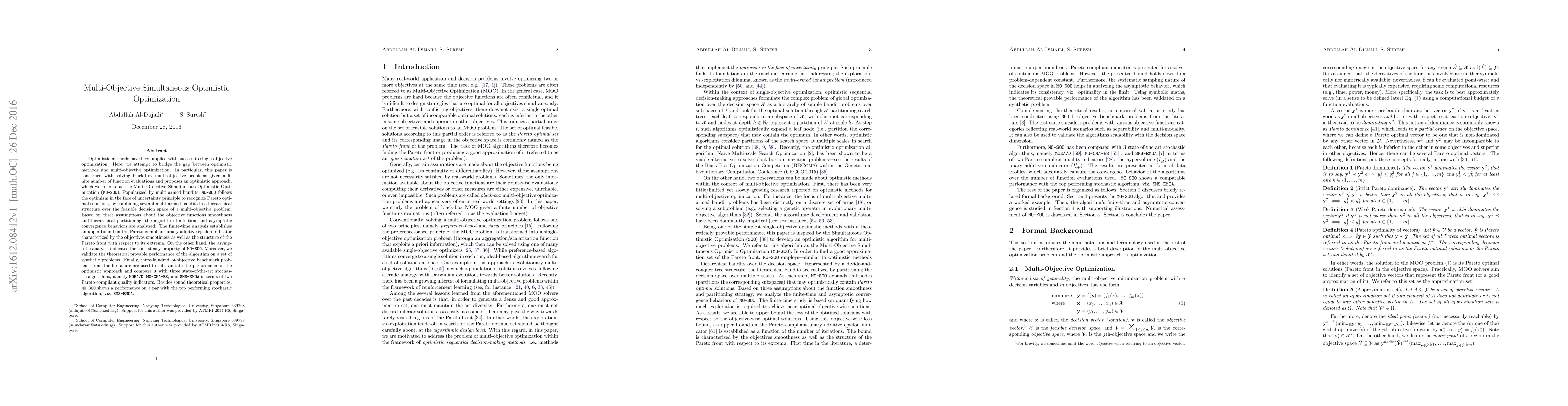 This paper introduces Multi-Objective Simultaneous Optimistic Optimization (MO-SOO), an optimistic approach to solve black-box multi-objective optimization problems with limited evaluations. The algorithm combines multi-armed bandit strategies to identify Pareto optimal solutions, demonstrating convergence properties and competitive performance against state-of-the-art stochastic algorithms on benchmark problems.