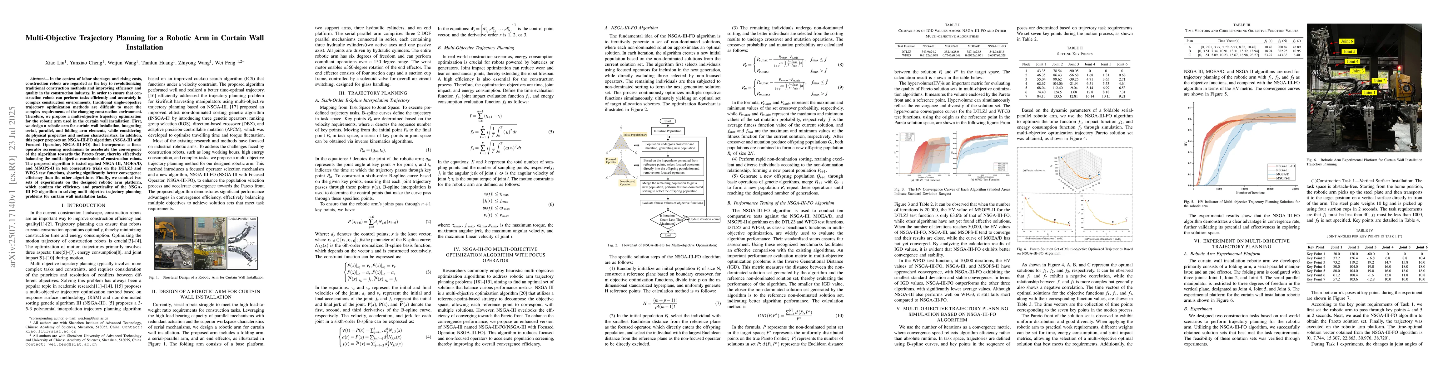 In the context of labor shortages and rising costs, construction robots are regarded as the key to revolutionizing traditional construction methods and improving efficiency and quality in the construction industry. In order to ensure that construction robots can perform tasks efficiently and accurately in complex construction environments, traditional single-objective trajectory optimization methods are difficult to meet the complex requirements of the changing construction environment. Therefore, we propose a multi-objective trajectory optimization for the robotic arm used in the curtain wall installation. First, we design a robotic arm for curtain wall installation, integrating serial, parallel, and folding arm elements, while considering its physical properties and motion characteristics. In addition, this paper proposes an NSGA-III-FO algorithm (NSGA-III with Focused Operator, NSGA-III-FO) that incorporates a focus operator screening mechanism to accelerate the convergence of the algorithm towards the Pareto front, thereby effectively balancing the multi-objective constraints of construction robots. The proposed algorithm is tested against NSGA-III, MOEA/D, and MSOPS-II in ten consecutive trials on the DTLZ3 and WFG3 test functions, showing significantly better convergence efficiency than the other algorithms. Finally, we conduct two sets of experiments on the designed robotic arm platform, which confirm the efficiency and practicality of the NSGA-III-FO algorithm in solving multi-objective trajectory planning problems for curtain wall installation tasks.