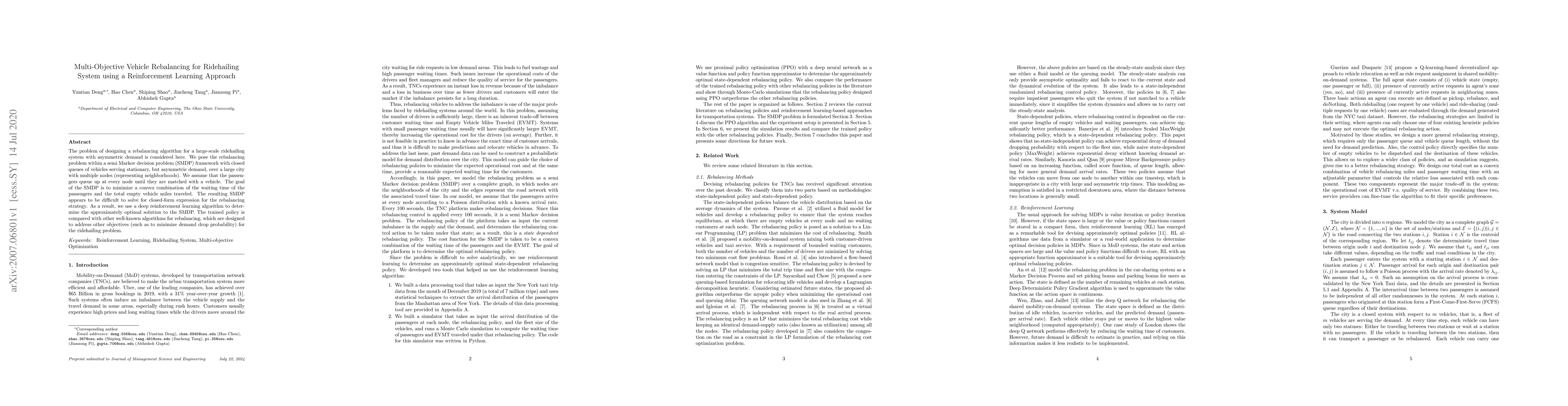 This paper proposes a deep reinforcement learning approach to solve the multi-objective rebalancing problem in ridehailing systems, aiming to minimize passenger waiting time and empty vehicle travel. The method is compared against traditional rebalancing algorithms to demonstrate its effectiveness.