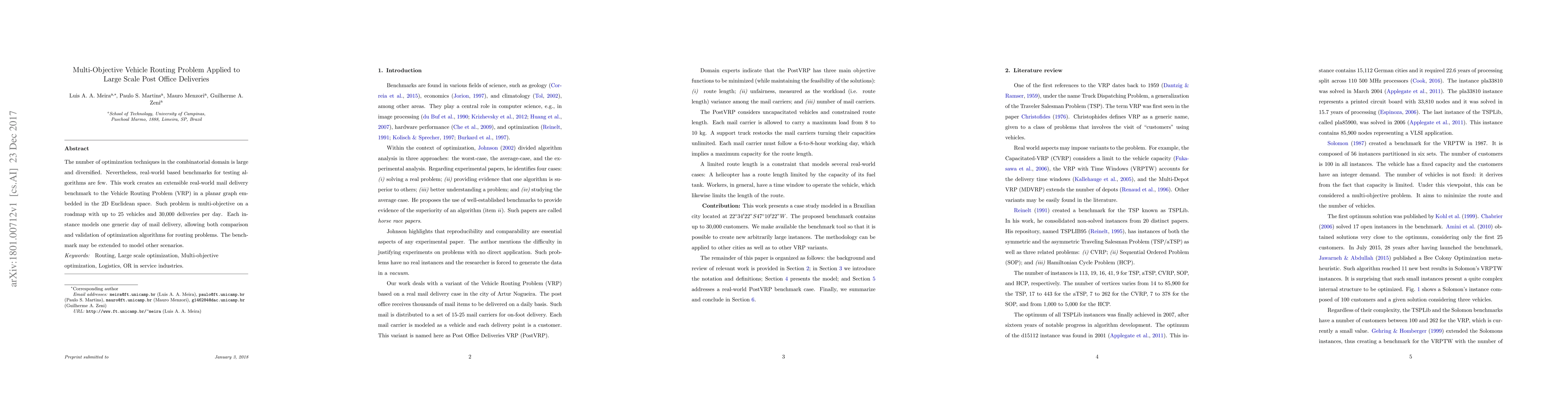 This paper introduces a multi-objective Vehicle Routing Problem (VRP) benchmark for large-scale post office deliveries, featuring up to 25 vehicles and 30,000 deliveries per day, designed to test optimization algorithms in a real-world setting. The benchmark is extensible and can model various scenarios beyond mail delivery.
