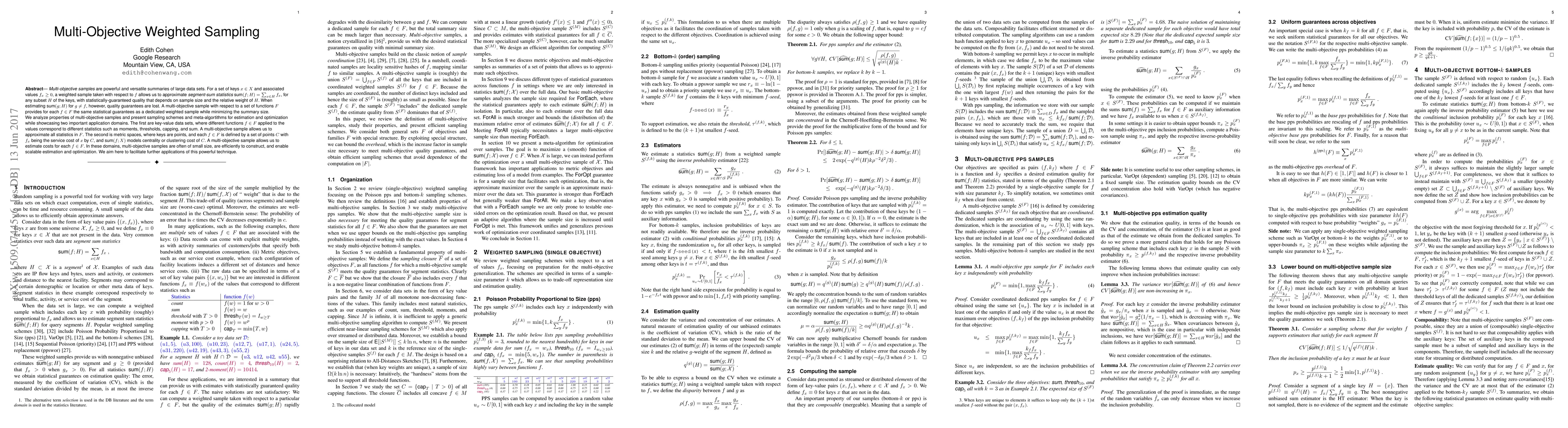 {\em Multi-objective samples} are powerful and versatile summaries of large data sets. For a set of keys $x\in X$ and associated values $f_x \geq 0$, a weighted sample taken with respect to $f$ allows us to approximate {\em segment-sum statistics} $\text{Sum}(f;H) = \text{sum}_{x\in H} f_x$, for any subset $H$ of the keys, with statistically-guaranteed quality that depends on sample size and the relative weight of $H$. When estimating $\text{Sum}(g;H)$ for $g\not=f$, however, quality guarantees are lost. A multi-objective sample with respect to a set of functions $F$ provides for each $f\in F$ the same statistical guarantees as a dedicated weighted sample while minimizing the summary size. We analyze properties of multi-objective samples and present sampling schemes and meta-algortithms for estimation and optimization while showcasing two important application domains. The first are key-value data sets, where different functions $f\in F$ applied to the values correspond to different statistics such as moments, thresholds, capping, and sum. A multi-objective sample allows us to approximate all statistics in $F$. The second is metric spaces, where keys are points, and each $f\in F$ is defined by a set of points $C$ with $f_x$ being the service cost of $x$ by $C$, and $\text{Sum}(f;X)$ models centrality or clustering cost of $C$. A multi-objective sample allows us to estimate costs for each $f\in F$. In these domains, multi-objective samples are often of small size, are efficiently to construct, and enable scalable estimation and optimization. We aim here to facilitate further applications of this powerful technique.