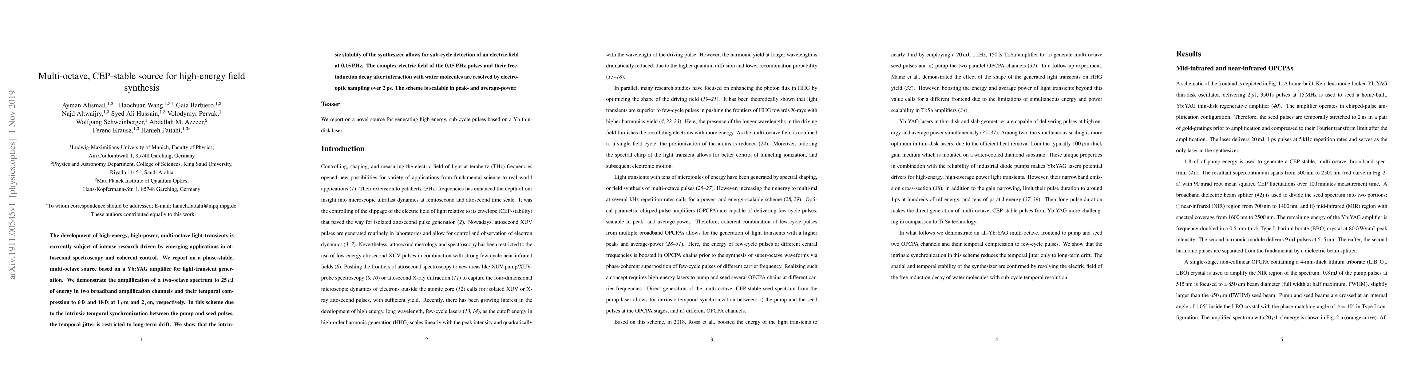 The development of high-energy, high-power, multi-octave light-transients is currently subject of intense research driven by emerging applications in attosecond spectroscopy and coherent control. We report on a phase-stable, multi-octave source based on a Yb:YAG amplifier for light-transient generation. We demonstrate the amplification of a two-octave spectrum to 25\,$\mu$J of energy in two broadband amplification channels and their temporal compression to 6\,fs and 18\,fs at 1\,$\mu$m and 2\,$\mu$m, respectively. In this scheme due to the intrinsic temporal synchronization between the pump and seed pulses, the temporal jitter is restricted to long-term drift. We show that the intrinsic stability of the synthesizer allows for sub-cycle detection of an electric field at 0.15\,PHz. The complex electric field of the 0.15\,PHz pulses and their free-induction decay after interaction with water molecules are resolved by electro-optic sampling over 2\,ps. The scheme is scalable in peak- and average-power.