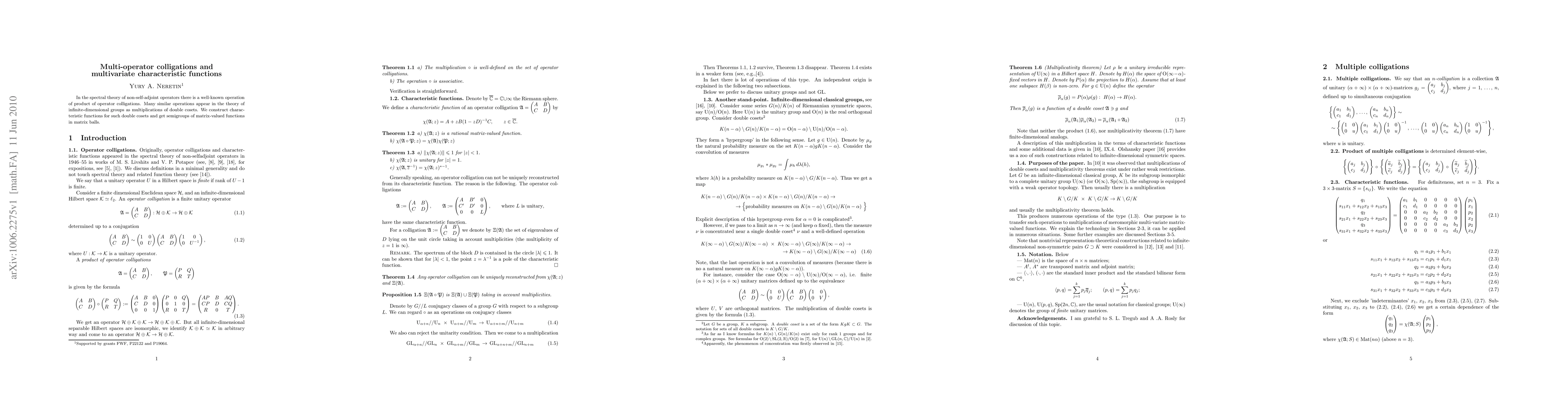 In the spectral theory of non-self-adjoint operators there is a well-known operation of product of operator colligations. Many similar operations appear in the theory of infinite-dimensional groups as multiplications of double cosets. We construct characteristic functions for such double cosets and get semigroups of matrix-valued functions in matrix balls.