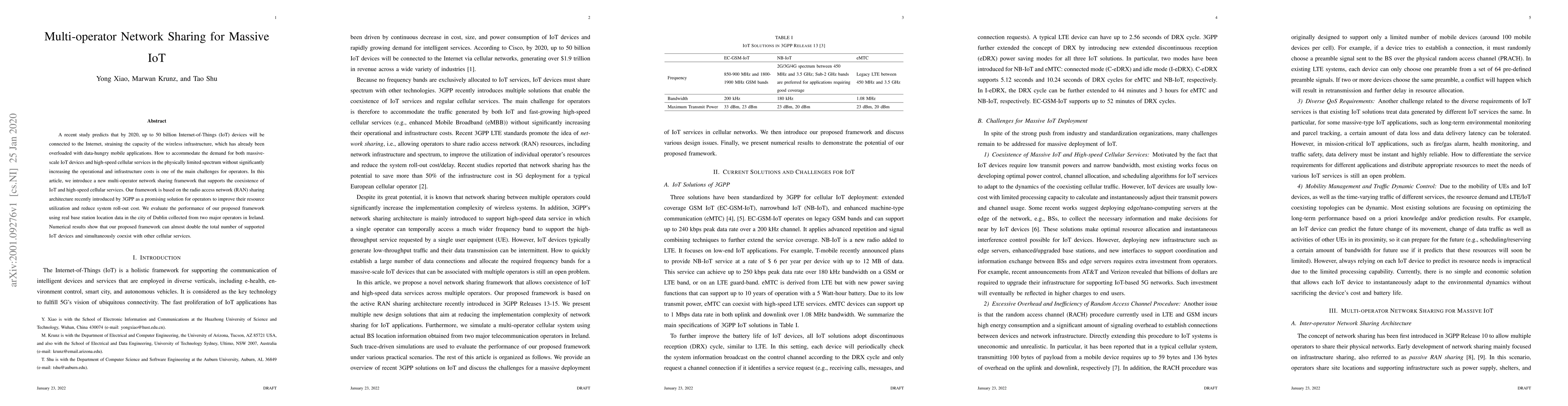 This paper proposes a multi-operator network sharing framework to accommodate massive IoT devices and high-speed cellular services within limited spectrum. The framework leverages 3GPP's RAN sharing architecture to enhance resource utilization and reduce costs, achieving nearly double the IoT device support compared to non-shared networks.