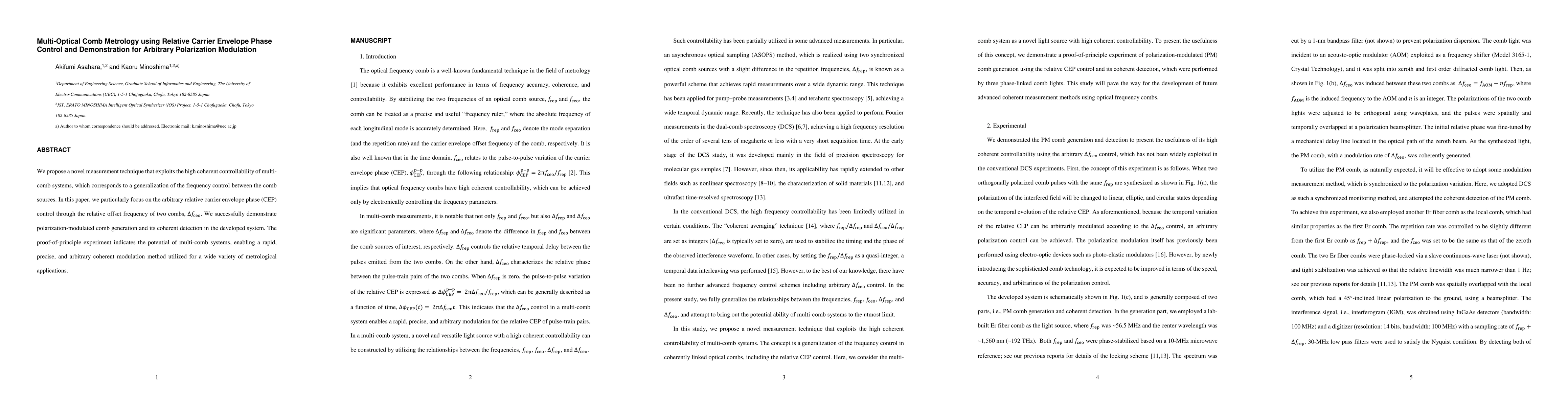 This paper proposes a novel measurement technique leveraging multi-comb systems for precise frequency control, specifically focusing on arbitrary relative carrier envelope phase control. The authors demonstrate polarization-modulated comb generation and its coherent detection, showcasing the potential for a rapid, precise modulation method in various metrological applications.