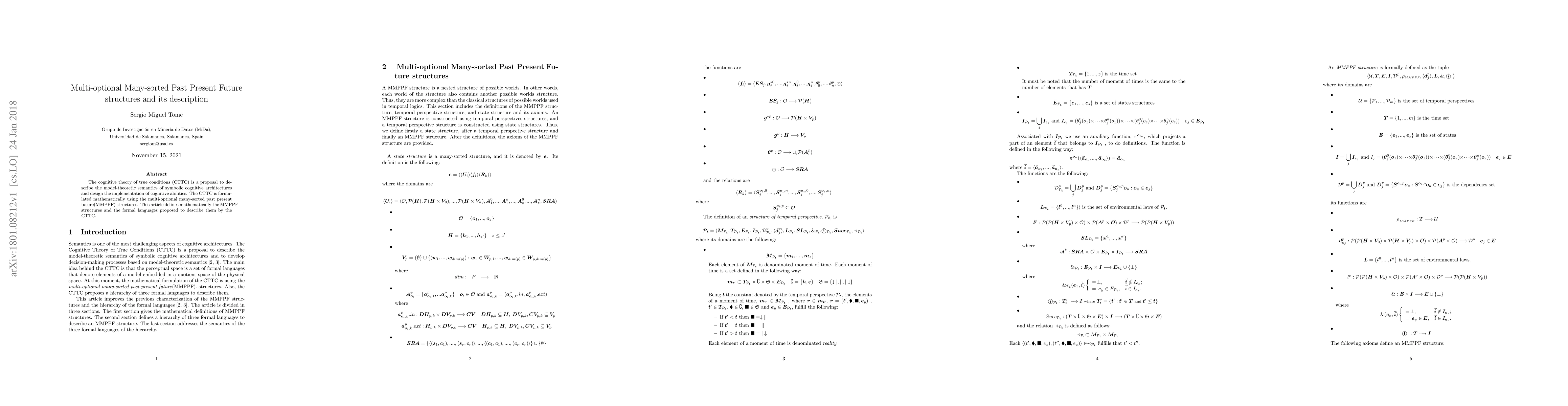 The cognitive theory of true conditions (CTTC) is a proposal to describe the model-theoretic semantics of symbolic cognitive architectures and design the implementation of cognitive abilities. The CTTC is formulated mathematically using the multi-optional many-sorted past present future(MMPPF) structures. This article defines mathematically the MMPPF structures and the formal languages proposed to describe them by the CTTC.