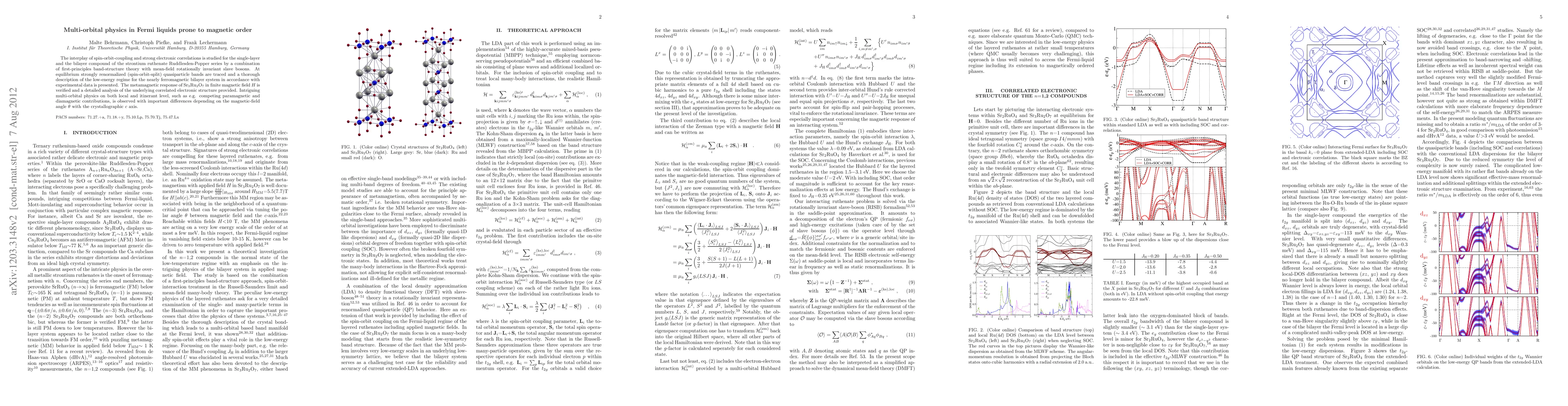 The interplay of spin-orbit-coupling and strong electronic correlations is studied for the single-layer and the bilayer compound of the strontium ruthenate Ruddlesden-Popper series by a combination of first-principles band-structure theory with mean-field rotationally invariant slave bosons. At equilibrium strongly renormalized (spin-orbit-split) quasiparticle bands are traced and a thorough description of the low-energy regime for the nearly ferromagnetic bilayer system in accordance with experimental data is presented. The metamagnetic response of Sr$_3$Ru$_2$O$_7$ in finite magnetic field $H$ is verified and a detailed analysis of the underlying correlated electronic structure provided. Intriguing multi-orbital physics on both local and itinerant level, such as e.g. competing paramagnetic and diamagnetic contributions, is observed with important differences depending on the magnetic-field angle $\theta$ with the crystallographic c axis.