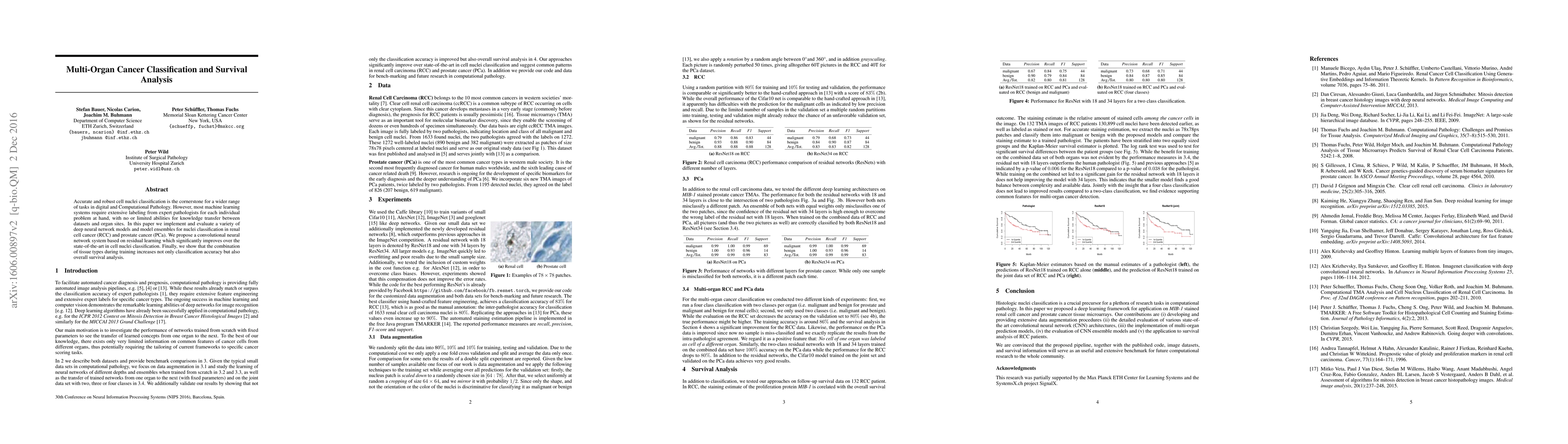 Accurate and robust cell nuclei classification is the cornerstone for a wider range of tasks in digital and Computational Pathology. However, most machine learning systems require extensive labeling from expert pathologists for each individual problem at hand, with no or limited abilities for knowledge transfer between datasets and organ sites. In this paper we implement and evaluate a variety of deep neural network models and model ensembles for nuclei classification in renal cell cancer (RCC) and prostate cancer (PCa). We propose a convolutional neural network system based on residual learning which significantly improves over the state-of-the-art in cell nuclei classification. Finally, we show that the combination of tissue types during training increases not only classification accuracy but also overall survival analysis.