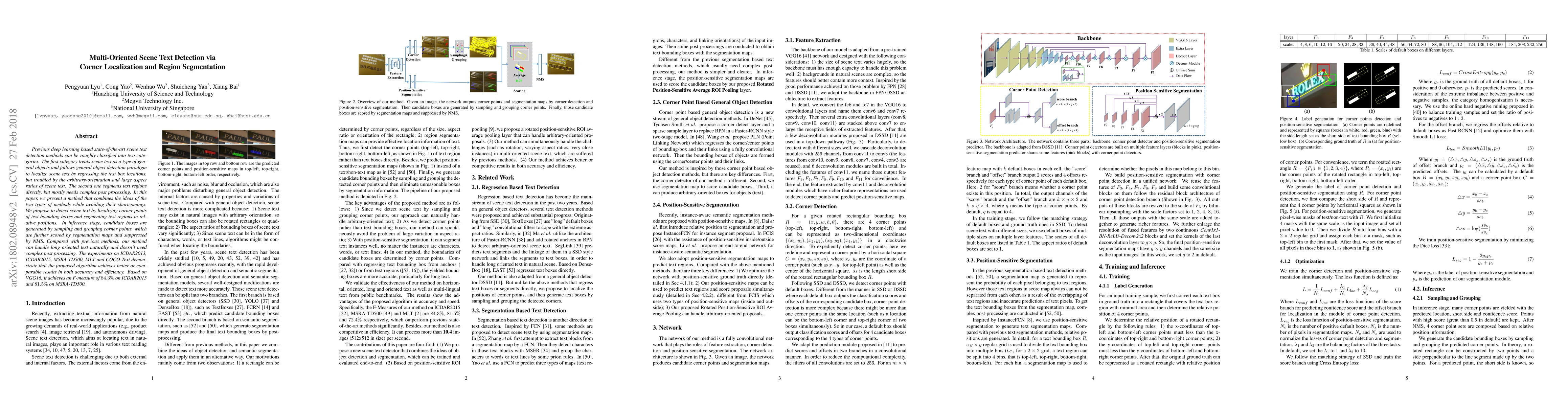 This paper proposes a novel scene text detection method that combines corner localization and region segmentation to address the challenges of arbitrary-oriented and large aspect ratio texts. The method generates candidate boxes via corner points and uses segmentation maps for scoring, achieving better accuracy and efficiency compared to previous approaches.