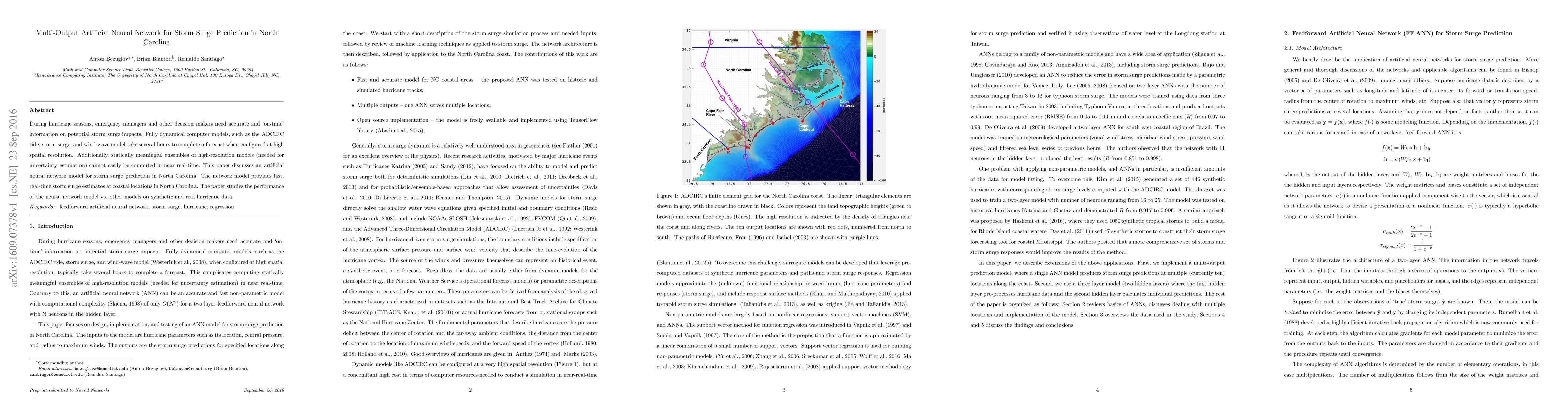 This paper proposes an artificial neural network model for rapid storm surge predictions in North Carolina, offering real-time estimates to aid emergency management during hurricane seasons. The model's performance is compared to traditional dynamical models, demonstrating its efficiency in providing timely forecasts.