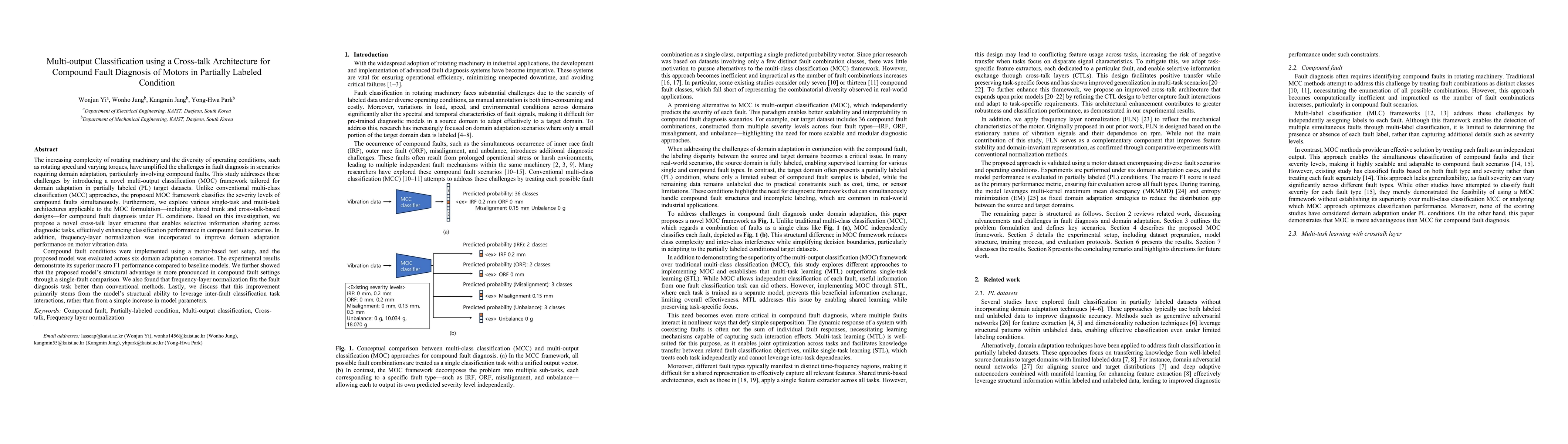 The research introduces a novel multi-output classification (MOC) framework for compound fault diagnosis in partially labeled (PL) target datasets, employing single-task and multi-task architectures like shared trunk and cross-talk designs. Frequency-layer normalization is incorporated for improved domain adaptation on motor vibration data.