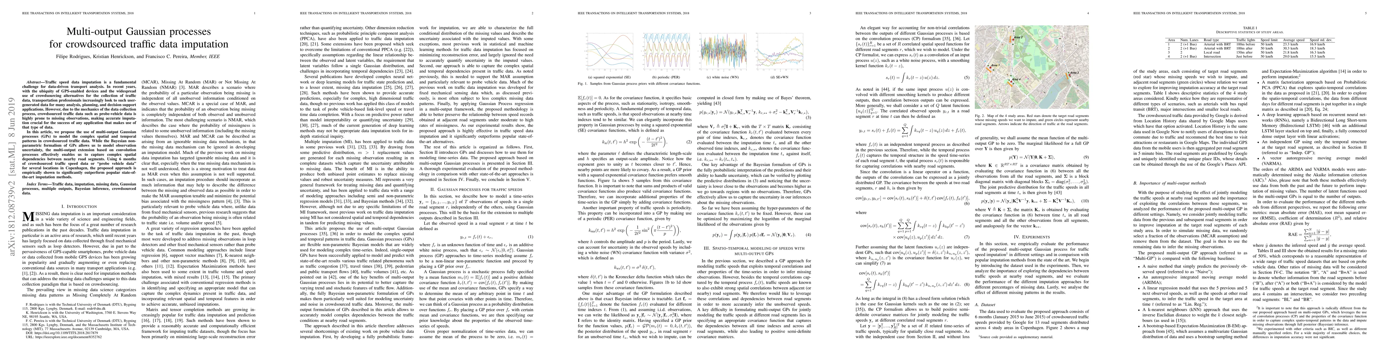 This paper proposes multi-output Gaussian processes for accurately imputing missing values in crowdsourced traffic speed data, capturing spatial dependencies and outperforming existing methods. The approach is validated using six months of probe vehicle data from Copenhagen.