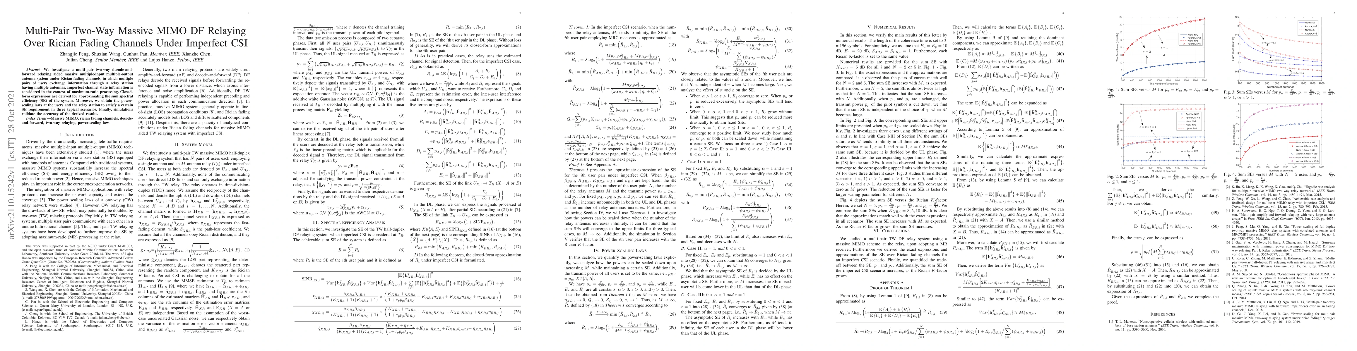 This paper explores multi-pair two-way massive MIMO DF relaying over Rician fading channels with imperfect channel state information, deriving closed-form expressions for sum spectral efficiency and power scaling laws under various scenarios. Simulation results confirm the accuracy of the theoretical approximations.
