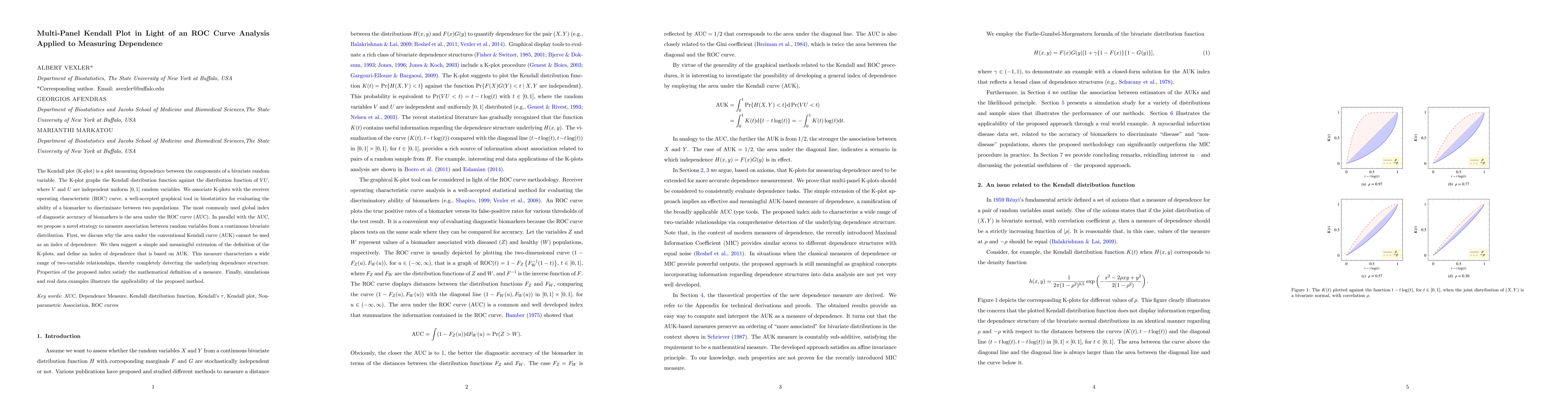 This paper proposes a novel method to measure dependence between components of a bivariate random variable using a multi-panel Kendall plot associated with ROC curve analysis. It introduces a new index of dependence based on the area under the extended Kendall curve, which better captures the underlying dependence structure compared to conventional methods.