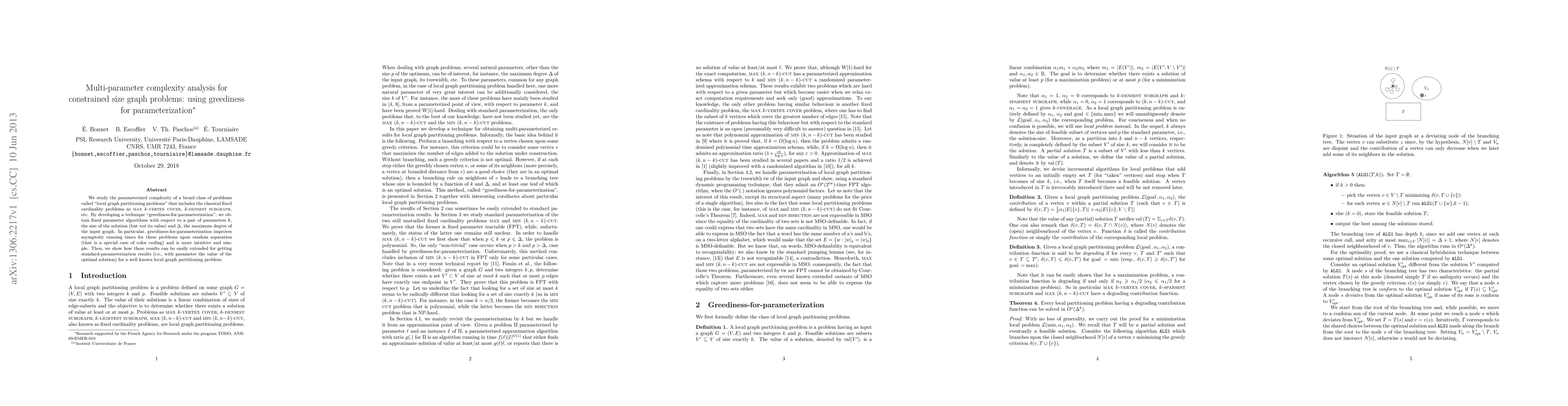 This paper develops a "greediness-for-parameterization" technique to achieve fixed-parameter algorithms for local graph partitioning problems, improving upon random separation methods. It demonstrates enhanced efficiency and simplicity, and extends these results to standard-parameterization for a notable local graph partitioning problem.
