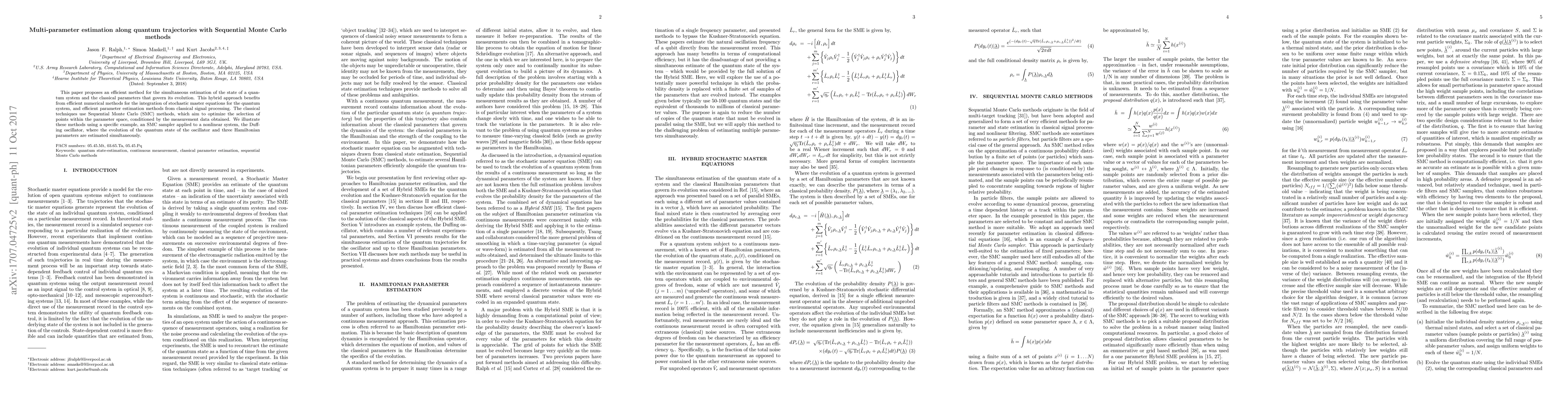 This paper proposes a hybrid method combining Sequential Monte Carlo (SMC) techniques for efficient parameter estimation with stochastic master equations for quantum system dynamics, demonstrated through the estimation of parameters in a Duffing oscillator. The approach optimizes parameter selection based on measurement data to simultaneously track the quantum state and classical parameters.