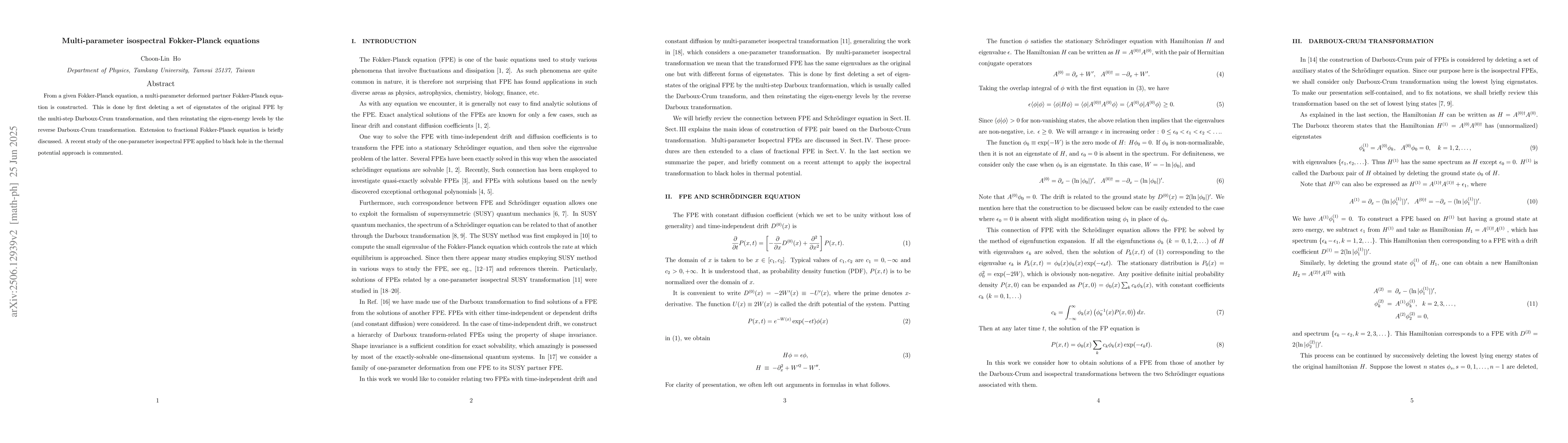 From a given Fokker-Planck equation, a multi-parameter deformed partner Fokker-Planck equation is constructed. This is done by first deleting a set of eigenstates of the original FPE by the multi-step Darboux-Crum transformation, and then reinstating the eigen-energy levels by the reverse Darboux-Crum transformation. Extension to fractional Fokker-Planck equation is briefly discussed. A recent study of the one-parameter isospectral FPE applied to black hole in the thermal potential approach is commented.