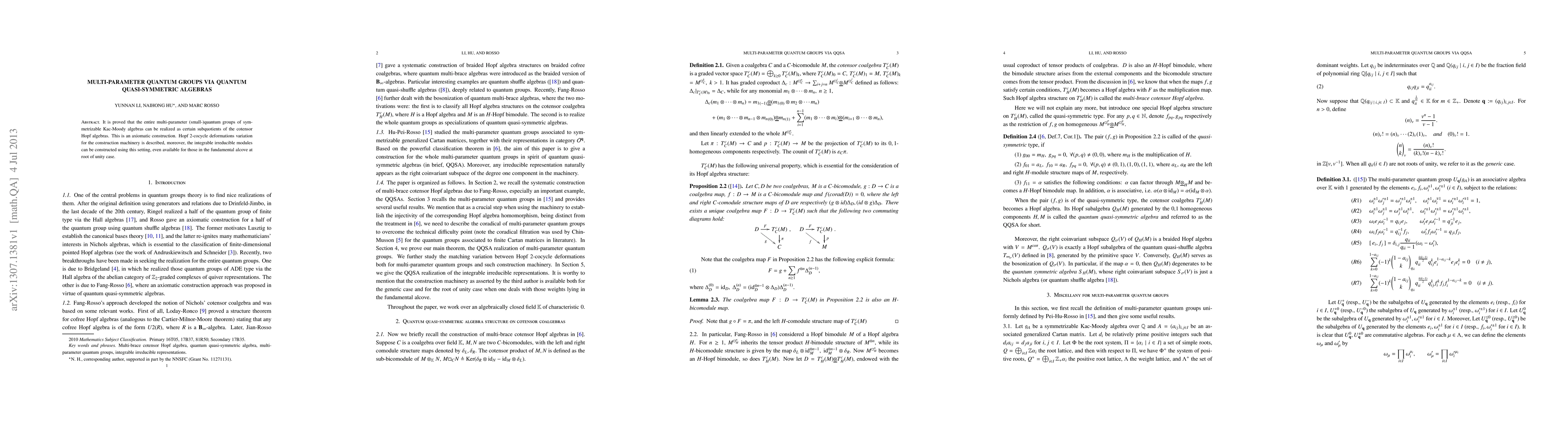 This paper constructs multi-parameter quantum groups via quantum quasi-symmetric algebras as subquotients of cotensor Hopf algebras, employing Hopf 2-cocycle deformations, and provides a framework for constructing integrable irreducible modules, including those in the fundamental alcove at root of unity.
