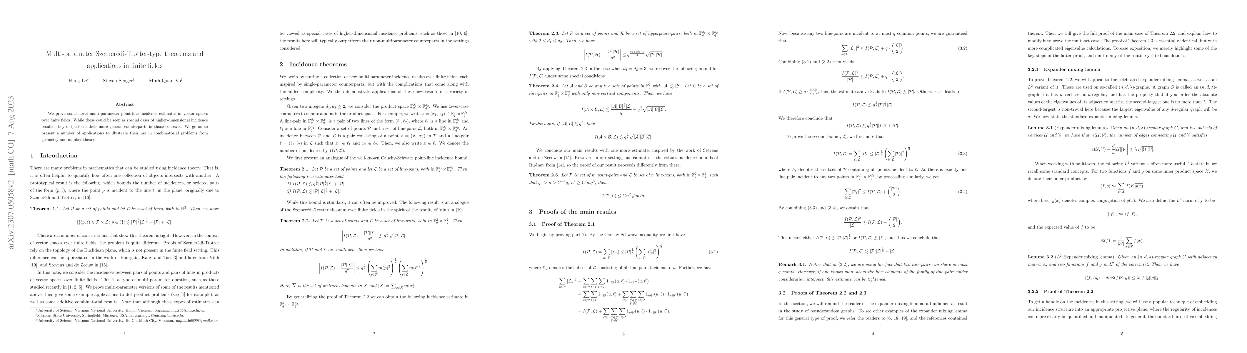 We prove some novel multi-parameter point-line incidence estimates in vector spaces over finite fields. While these could be seen as special cases of higher-dimensional incidence results, they outperform their more general counterparts in those contexts. We go on to present a number of applications to illustrate their use in combinatorial problems from geometry and number theory.