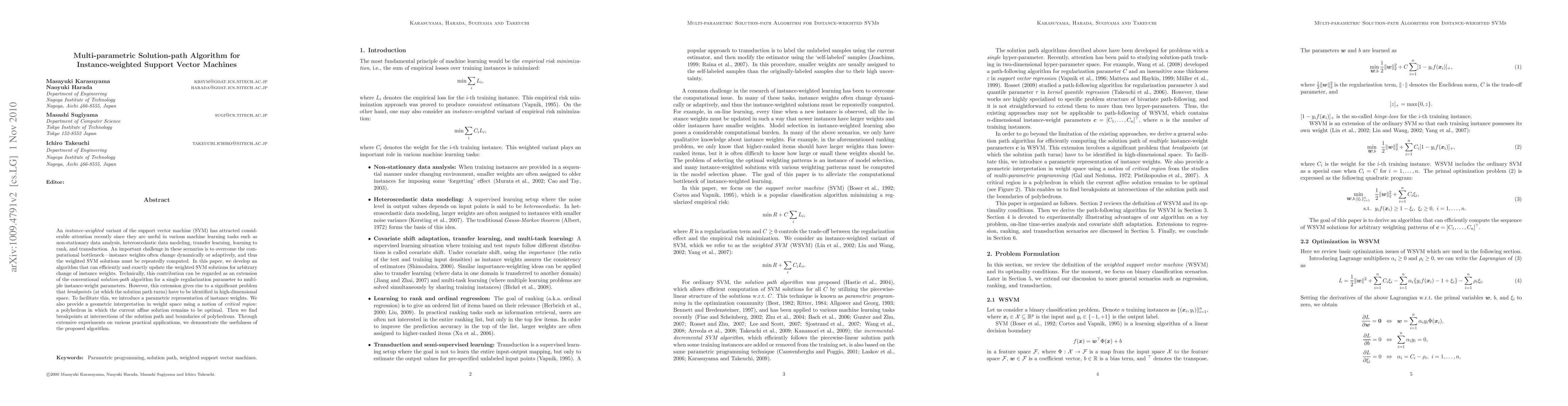 This paper presents a multi-parametric solution-path algorithm for instance-weighted support vector machines, addressing the computational challenge of dynamically changing instance weights. The proposed algorithm efficiently updates the SVM solutions by identifying breakpoints in high-dimensional weight space using a parametric representation and geometric interpretation.