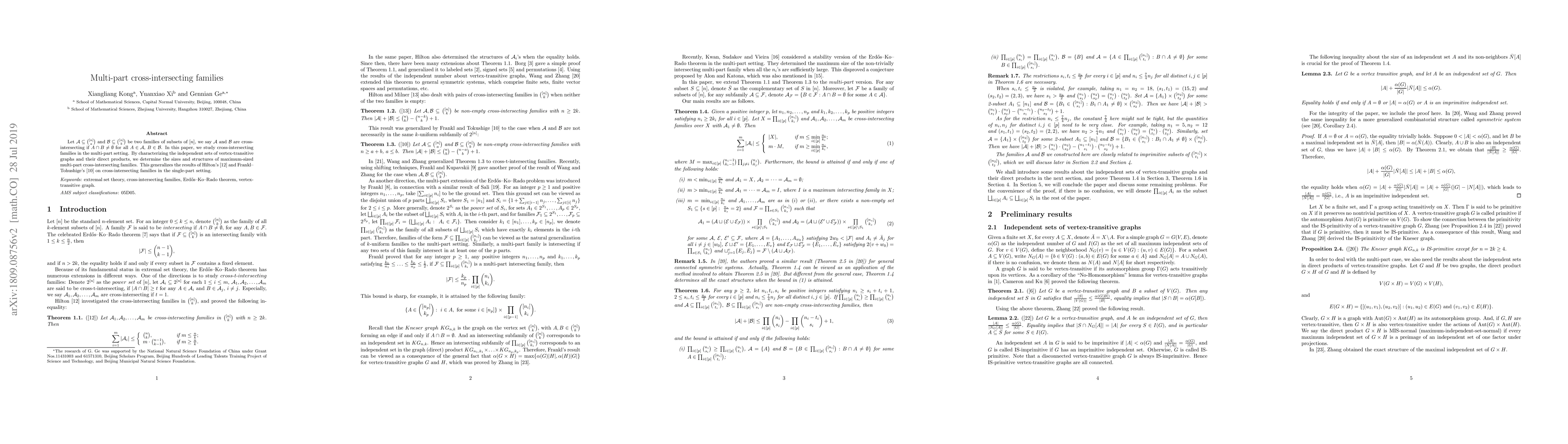 This paper investigates multi-part cross-intersecting families of subsets, determining the sizes and structures of maximum-sized families through the characterization of independent sets in vertex-transitive graphs and their direct products. The findings generalize previous results on single-part cross-intersecting families.