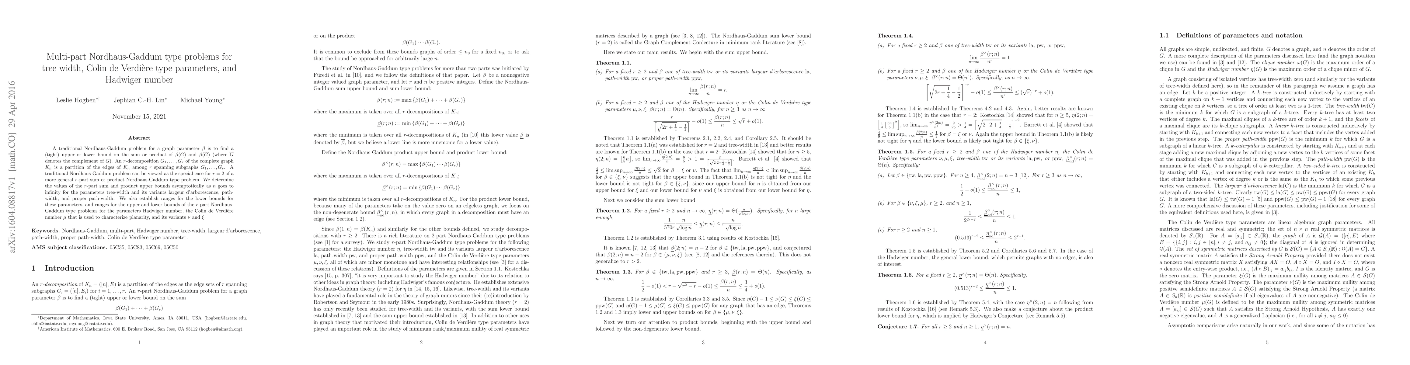 A traditional Nordhaus-Gaddum problem for a graph parameter $\beta$ is to find a (tight) upper or lower bound on the sum or product of $\beta(G)$ and $\beta(\bar{G})$ (where $\bar{G}$ denotes the complement of $G$). An $r$-decomposition $G_1,\dots,G_r$ of the complete graph $K_n$ is a partition of the edges of $K_n$ among $r$ spanning subgraphs $G_1,\dots,G_r$. A traditional Nordhaus-Gaddum problem can be viewed as the special case for $r=2$ of a more general $r$-part sum or product Nordhaus-Gaddum type problem. We determine the values of the $r$-part sum and product upper bounds asymptotically as $n$ goes to infinity for the parameters tree-width and its variants largeur d'arborescence, path-width, and proper path-width. We also establish ranges for the lower bounds for these parameters, and ranges for the upper and lower bounds of the $r$-part Nordhaus-Gaddum type problems for the parameters Hadwiger number, the Colin de Verdi\`ere number $\mu$ that is used to characterize planarity, and its variants $\nu$ and $\xi$.