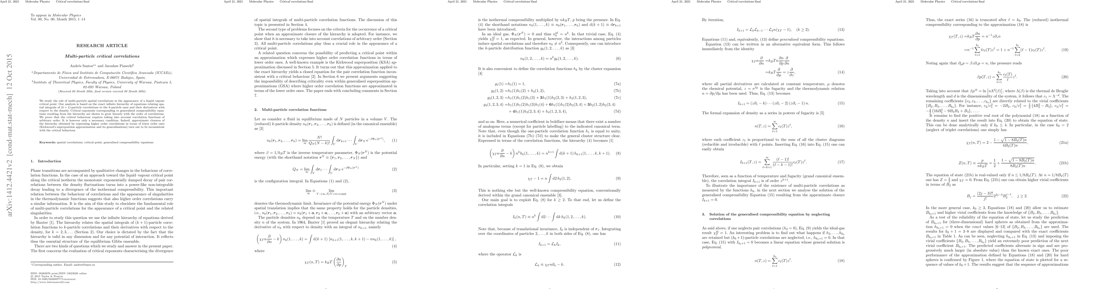 We study the role of multi-particle spatial correlations in the appearance of a liquid-vapour critical point. Our analysis is based on the exact infinite hierarchy of equations relating spatial integrals of $(k+1)$-particle correlations to the $k$-particle ones and their derivatives with respect to the density. Critical exponents corresponding to generalized compressibility equations resulting from the hierarchy are shown to grow linearly with the order of correlations. We prove that the critical behaviour requires taking into account correlation functions of arbitrary order. It is however only a necessary condition. Indeed, approximate closures of the hierarchy obtained by expressing higher order correlations in terms of lower order ones (Kirkwood's superposition approximation and its generalizations) turn out to be inconsistent with the critical behaviour.
