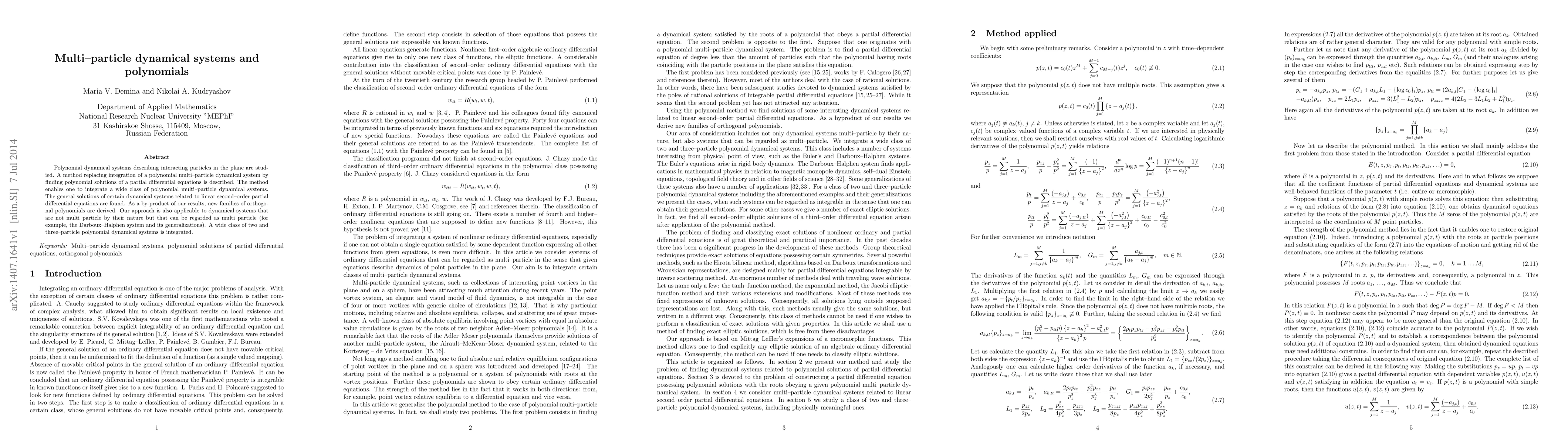 Polynomial dynamical systems describing interacting particles in the plane are studied. A method replacing integration of a polynomial multi--particle dynamical system by finding polynomial solutions of a partial differential equations is described. The method enables one to integrate a wide class of polynomial multi--particle dynamical systems. The general solutions of certain dynamical systems related to linear second--order partial differential equations are found. As a by-product of our results, new families of orthogonal polynomials are derived. Our approach is also applicable to dynamical systems that are not multi--particle by their nature but that can be regarded as multi--particle (for example, the Darboux--Halphen system and its generalizations). A wide class of two and three--particle polynomial dynamical systems is integrated.