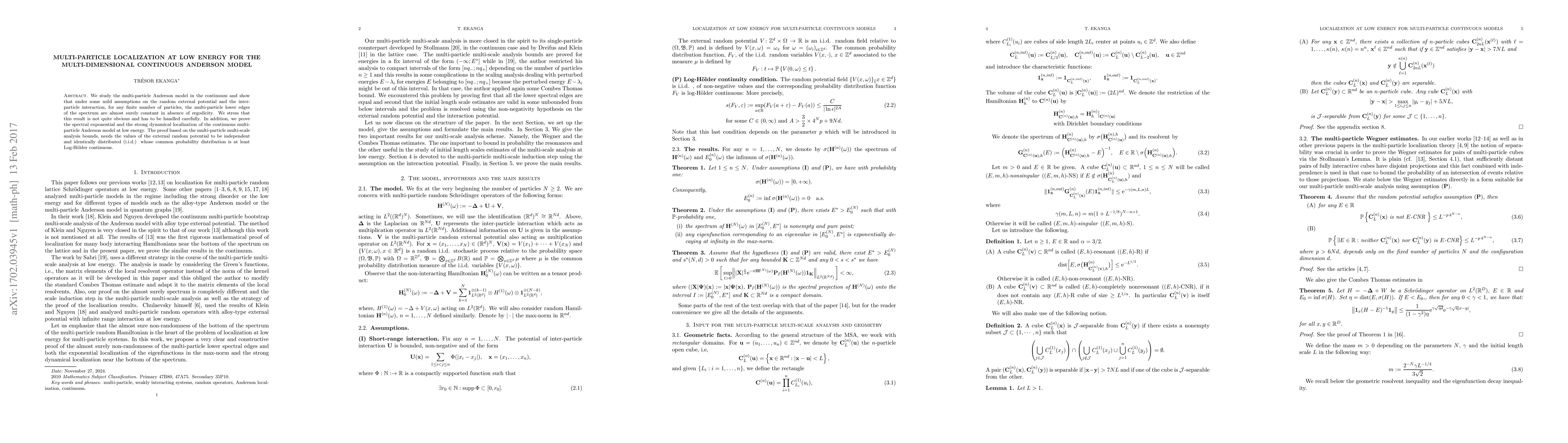 This paper investigates the multi-particle Anderson model in the continuum, demonstrating that under specific conditions, the lower edges of the spectrum remain constant for any finite number of particles in the absence of ergodicity. The study also proves spectral exponential and strong dynamical localization at low energy, relying on multi-particle multi-scale analysis and requiring the external random potential to be i.i.d. with a Log-Hölder continuous distribution.