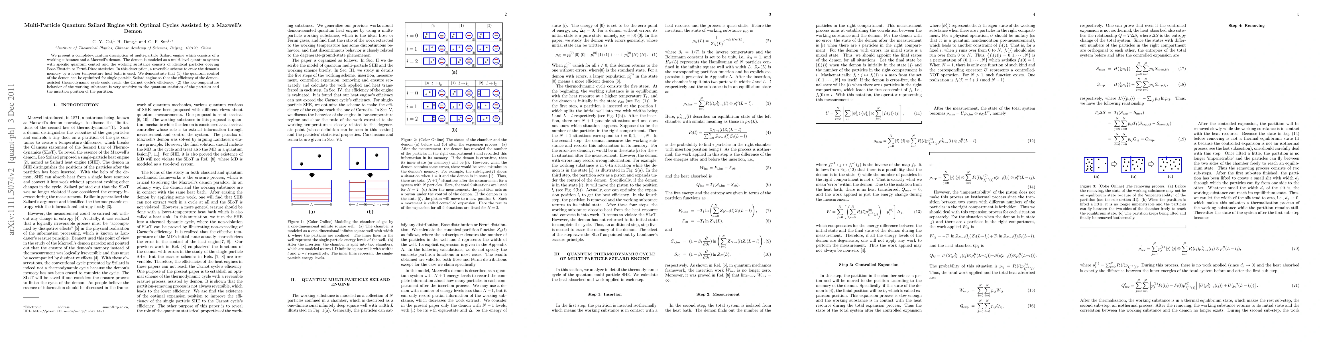 We present a complete-quantum description of multi-particle Szilard engine which consists of a working substance and a Maxwell's demon. The demon is modeled as a multi-level quantum system with specific quantum control and the working substance consists of identical particles obeying Bose-Einstein or Fermi-Dirac statistics. In this description, a reversible scheme to erase the demon's memory by a lower temperature heat bath is used. We demonstrate that (1) the quantum control of the demon can be optimized for single-particle Szilard engine so that the efficiency of the demon-assisted thermodynamic cycle could reach the Carnot cycle's efficiency; (2) the low-temperature behavior of the working substance is very sensitive to the quantum statistics of the particles and the insertion position of the partition.