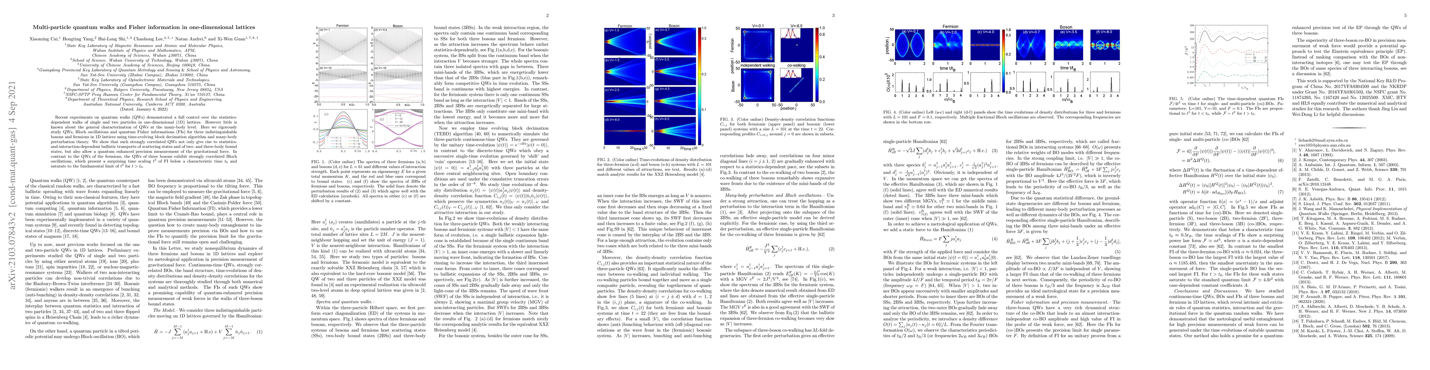 Recent experiments on quantum walks (QWs) of a single and two particles demonstrated subtle quantum statistics-dependent walks in one-dimensional (1D) lattices. However the roles of interaction and quantum statistics in such a kind of walks are little known at a many-body level. In this letter, using time-evolving block decimation algorithm and many-body perturbation theory we rigorously study QWs, Bloch oscillations and quantum Fisher informations (FIs) for three indistinguishable bosons and fermions in 1D lattices. We show that such strongly correlated many-body QWs not only give rise to statistics-and-interaction-dependent ballistic transports of scattering states, two- and three-body bound states, but also present a quantum enhanced precision measurement of the gravitational force. It turns out that in contrast to the walks of the fermions, the QWs of three bosons exhibit richer dynamics of co-walkings and competitive Bloch oscillations, which remarkably present a surprising time scaling $t^3$ of FI below a characteristic time $t_0$ and saturate to the fundamental limit of $t^2$ for $t>t_0$.
