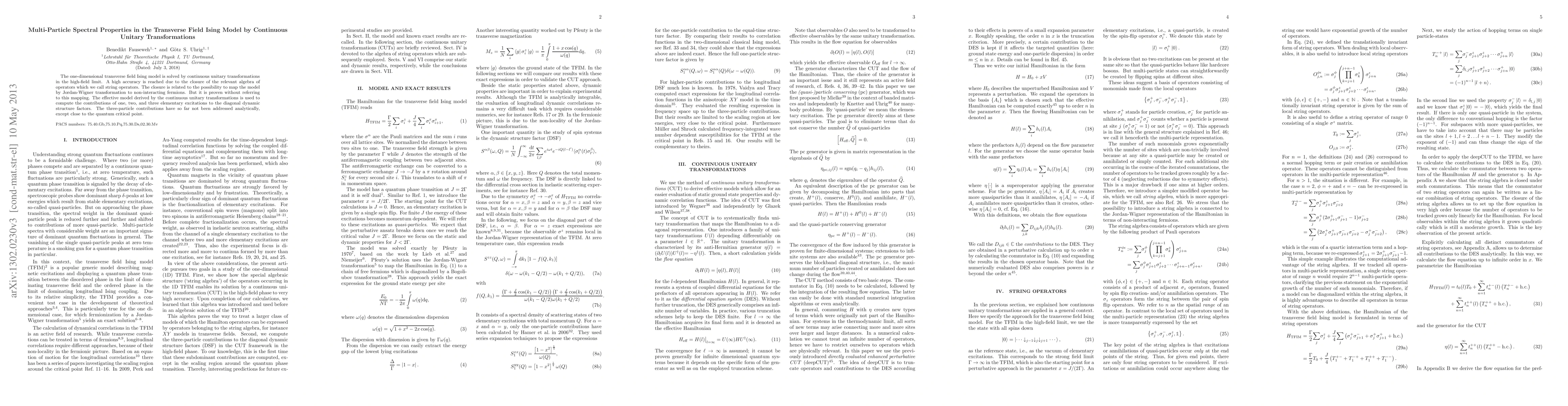 This paper solves the one-dimensional transverse field Ising model using continuous unitary transformations in the high-field limit, achieving high accuracy through the closure of string operators. The derived effective model computes contributions of one, two, and three excitations to the diagonal dynamic structure factors, particularly addressing the three-particle contributions analytically for the first time.