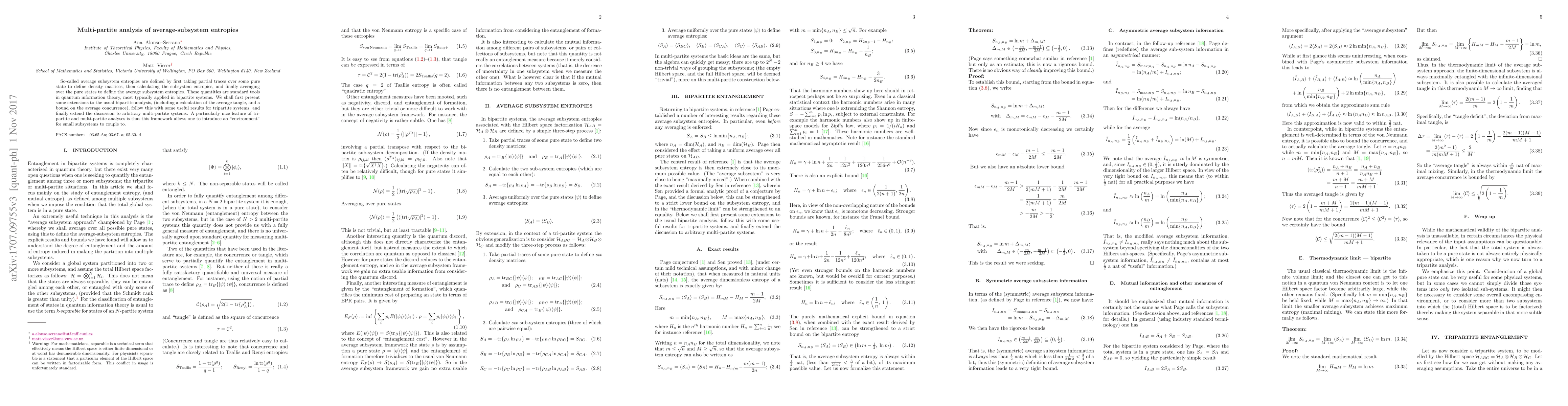This paper extends the concept of average subsystem entropies from bipartite to multi-partite quantum systems, introducing measures like average tangle and bounds on average concurrence. It also explores tripartite and multi-partite frameworks, allowing for the inclusion of an environment for small subsystems.