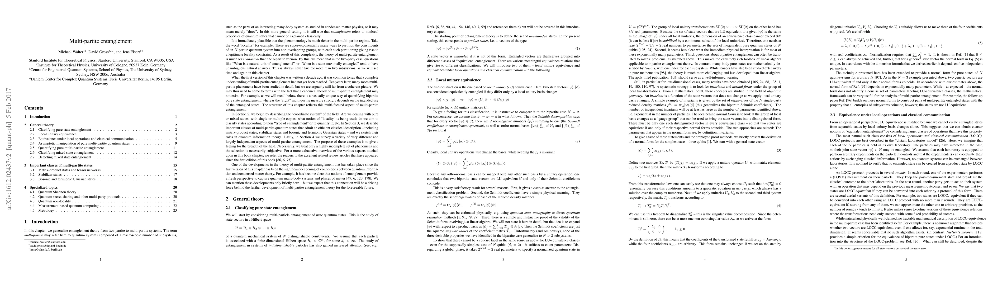 This paper provides an overview of multi-partite entanglement, defining key concepts and categories of entangled states like matrix product, stabilizer, and graph states. It concludes with applications in quantum networks, computation, and metrology.