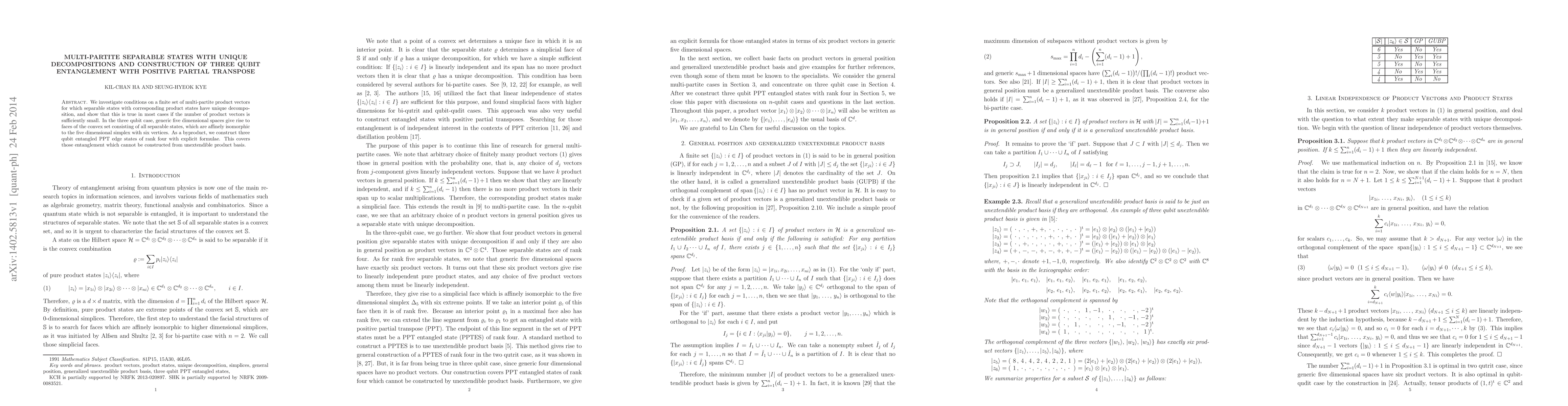 We investigate conditions on a finite set of multi-partite product vectors for which separable states with corresponding product states have unique decomposition, and show that this is true in most cases if the number of product vectors is sufficiently small. In the three qubit case, generic five dimensional spaces give rise to faces of the convex set consisting of all separable states, which are affinely isomorphic to the five dimensional simplex with six vertices. As a byproduct, we construct three qubit entangled PPT edge states of rank four with explicit formulae. This covers those entanglement which cannot be constructed from unextendible product basis.