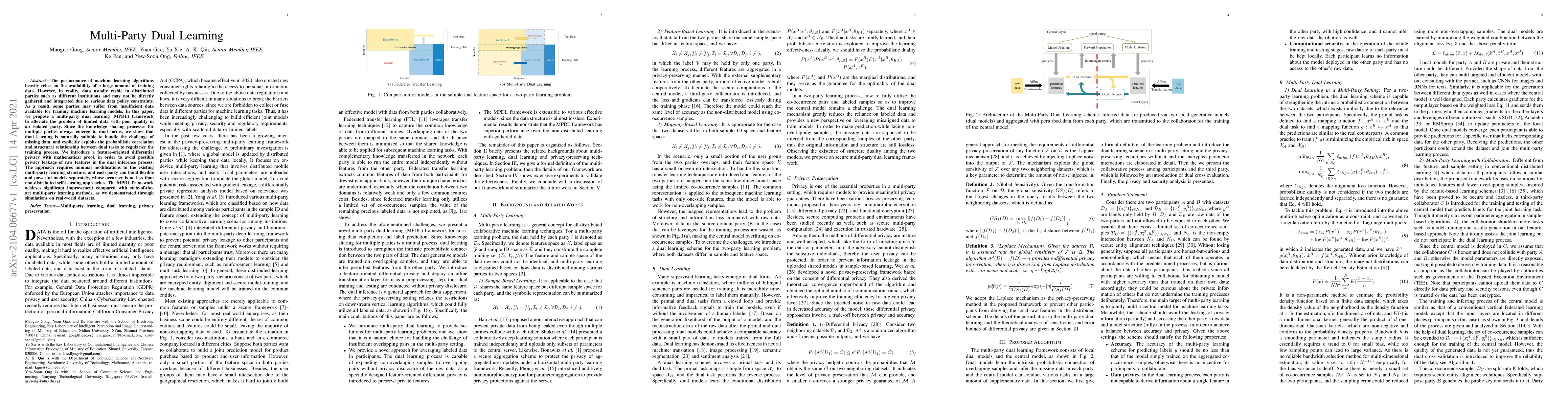 This paper introduces Multi-Party Dual Learning (MPDL) to address limited data issues in machine learning across distributed parties. MPDL uses dual learning to exploit task correlations, ensuring privacy with feature-oriented differential privacy. It improves model accuracy with minimal structural changes to existing multi-party learning, outperforming current methods in simulations on real-world datasets.
