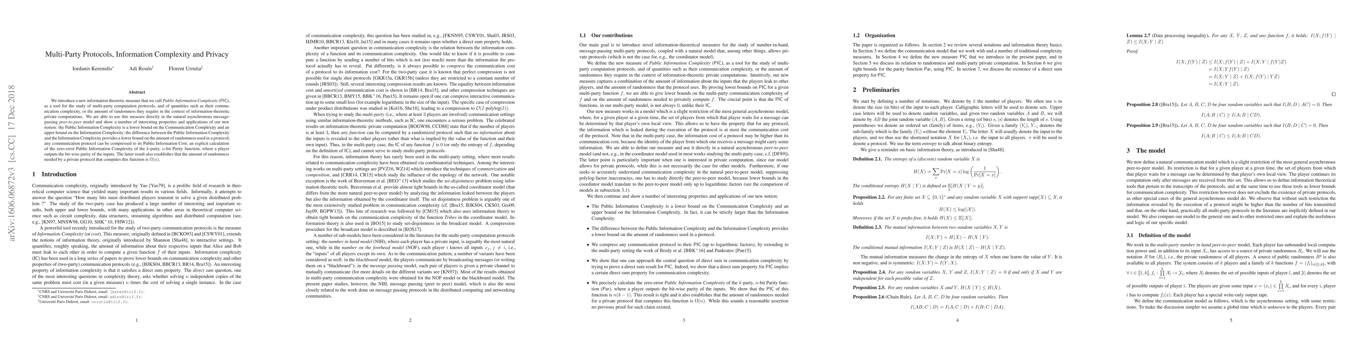 We introduce a new information theoretic measure that we call Public Information Complexity (PIC), as a tool for the study of multi-party computation protocols, and of quantities such as their communication complexity, or the amount of randomness they require in the context of information-theoretic private computations. We are able to use this measure directly in the natural asynchronous message-passing peer-to-peer model and show a number of interesting properties and applications of our new notion: the Public Information Complexity is a lower bound on the Communication Complexity and an upper bound on the Information Complexity; the difference between the Public Information Complexity and the Information Complexity provides a lower bound on the amount of randomness used in a protocol; any communication protocol can be compressed to its Public Information Cost; an explicit calculation of the zero-error Public Information Complexity of the $k$-party, $n$-bit Parity function, where a player outputs the bit-wise parity of the inputs. The latter result also establishes that the amount of randomness needed by a private protocol that computes this function is $\Omega(n)$.