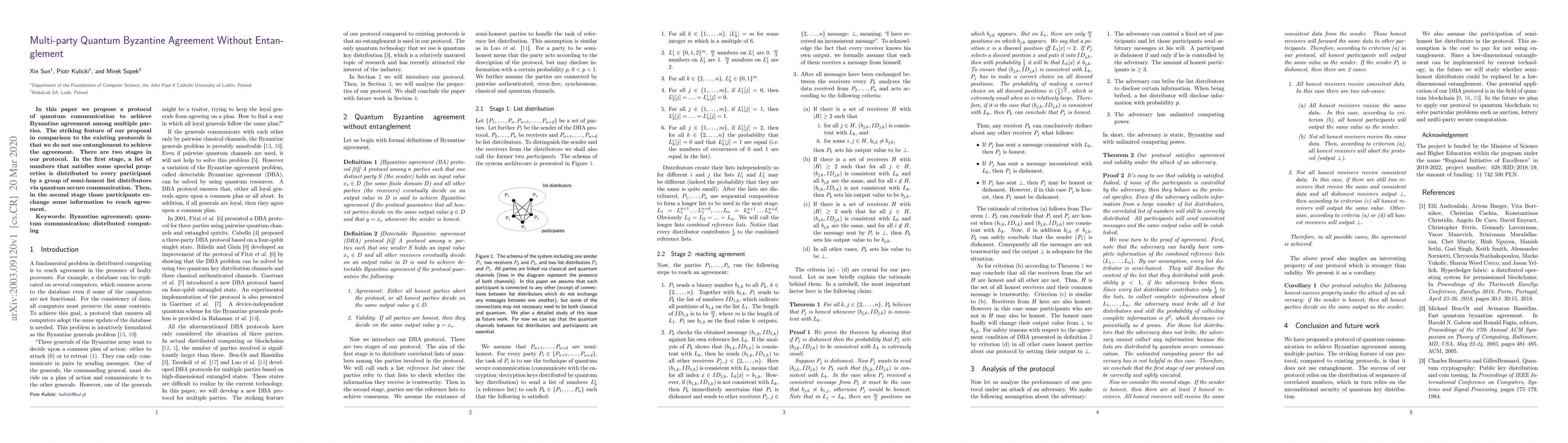The paper proposes a protocol for quantum communication to achieve Byzantine agreement among multiple parties without using entanglement. The protocol consists of two stages: (1) semi-honest list distributors use quantum secure communication to distribute correlated lists of numbers to all participants, and (2) participants use these lists to reach consensus via sequential composition and message exchange.